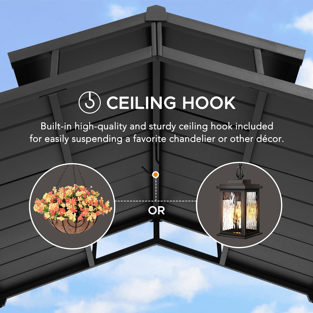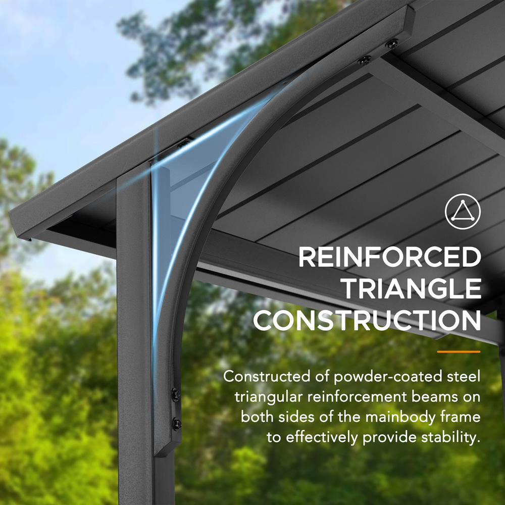 Kick back and enjoy your time grilling in the backyard even more with this grill gazebo from the world’s leading ready-to-assemble outdoor structure maker, Sunjoy. This grill gazebo is designed to protect your grill from nature's toughest elements. The 242 x 153cm powder-coated steel structure not only shelters your grill but also keeps you dry and cool any time you're cooking. No more standing in the rain or roasting in the sun while you flip burgers. The two-tier roof helps ventilate smoke. Handy accessories like a hook for light and built-in shelves make this gazebo functional and attractive. With straightforward, easy-to-follow assembly instructions you'll be relaxing in your favourite new outdoor cooking space in no time.