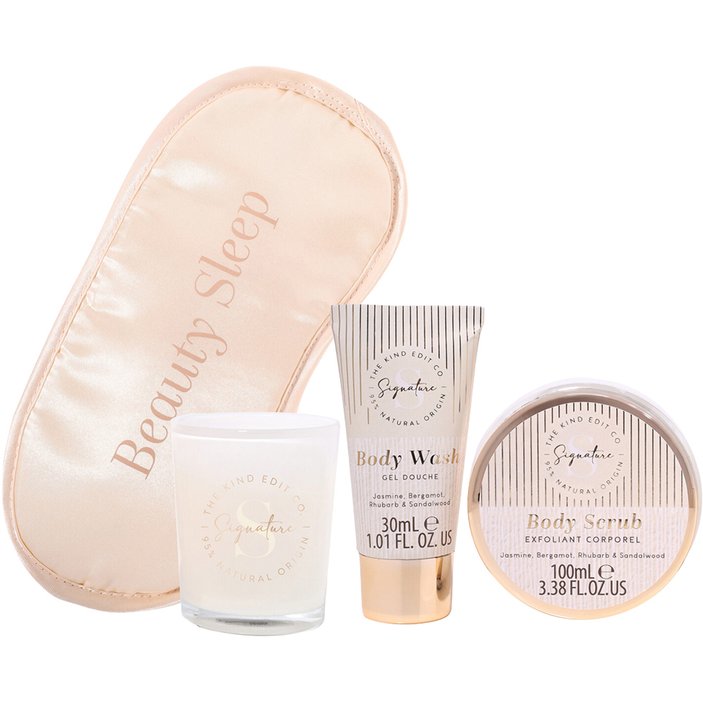 Elevating your nighttime routine with the Sunkissed Beauty Sleep Set. This set comes with an eye mask, body butter, body wash, and candle, each designed to enhance your beauty regimen. Made using 95% natural origin ingredients, the body wash and body butter gently cleanse the skin, leaving it bright and glowing. Infused with a delicate floral scent, the sweet notes of jasmine and rhubarb collide with the robust bergamot and sandalwood, creating a delightful fragrance that'll leave you enchanted. Perfect for gifting, it's sure to transform your nighttime beauty rituals.