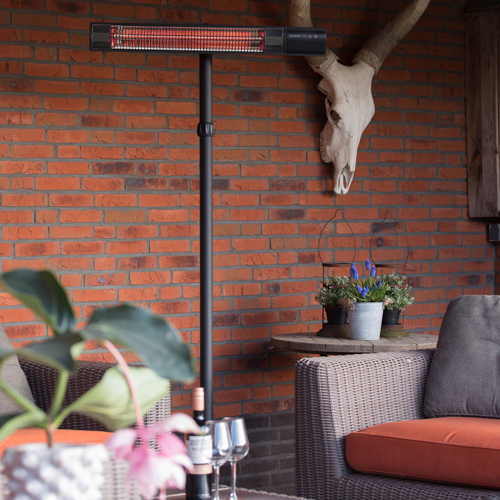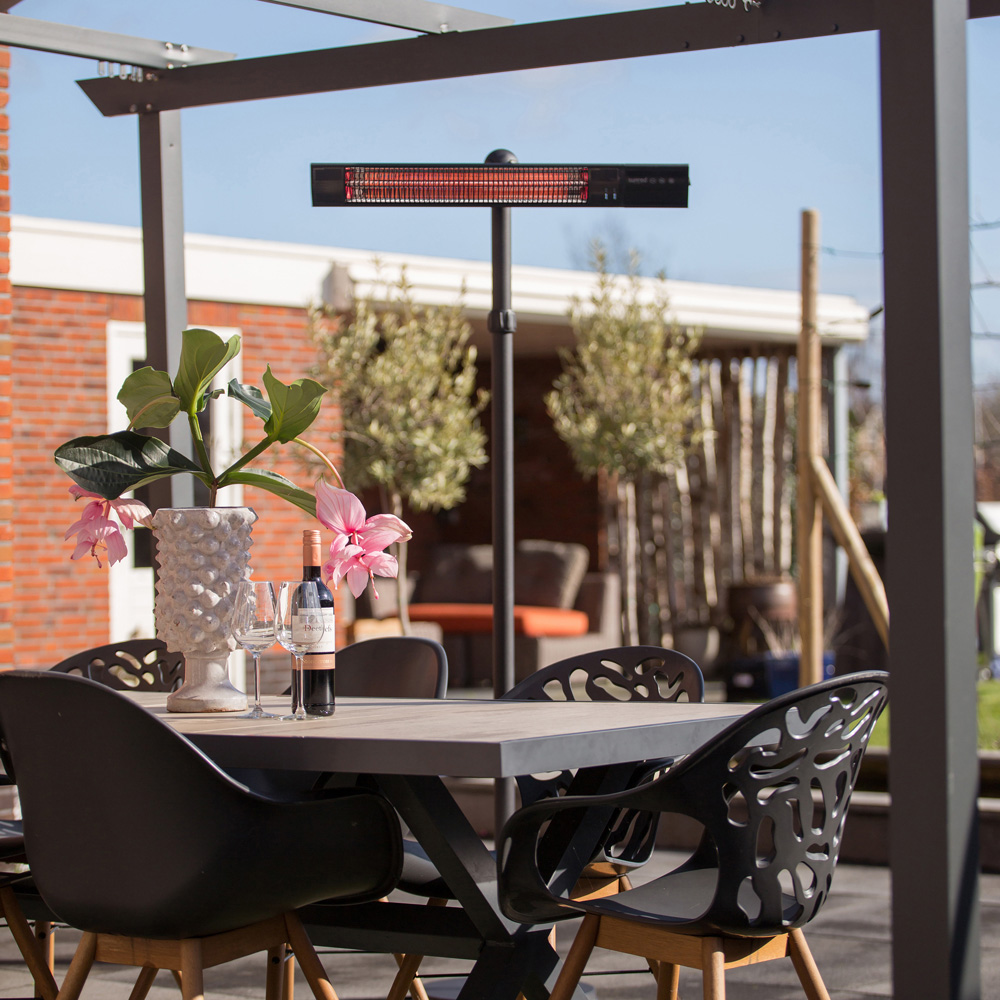 With this high-quality and functional patio heater from the Dark Range from SUNRED, you can enjoy an atmospheric evening outside in your garden or on the terrace. With the RD-DARK-25S you benefit from heat intensity of the highest level. The rose gold finish ensures that less bright light is emitted and the three power settings allow you to always enjoy the desired warmth. You can easily switch between 3 settings: 800, 1600 or 2500 Watt. When you switch on this electric patio heater with the remote control, you can enjoy the wonderful warmth within seconds. Due to the weighted base, the heater is firmly in place and will not fall over easily, but even if it should, the heater will automatically switch off due to the fall protection.