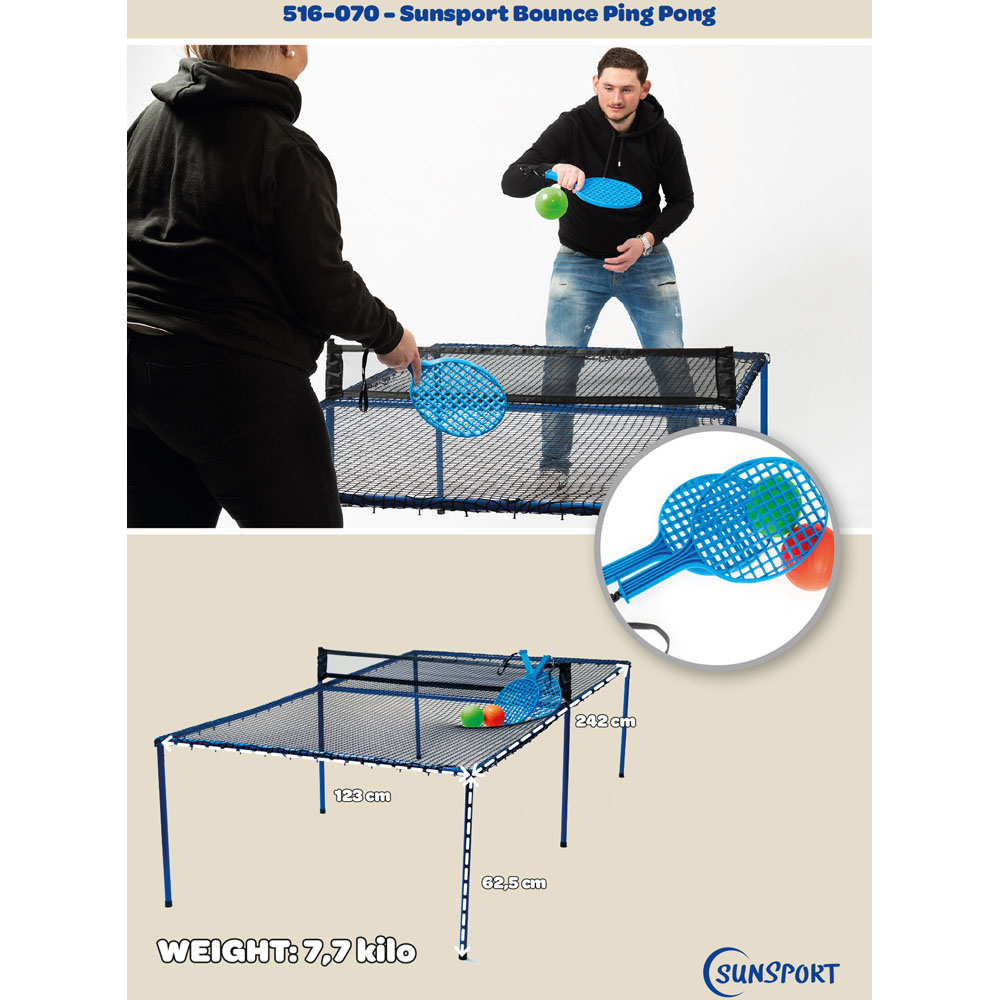 Bring a fresh twist to classic table tennis with a dynamic game that swaps the usual hard surface for a taut net and replaces the standard bat and ball with larger, more exciting gear, making it perfect for lively matches indoors or outside. Enjoy hours of entertainment with a robust powder-coated metal frame and a spacious playing area measuring 242 x 123 x 62.5cm, complete with everything you need, including bats, balls, net, pump and instructions, so you can set up quickly and play right away. Whether you're seeking an indoor ping pong table for home with delivery in the UK, a foldable table tennis set for small spaces or even a fun ping pong table rental for parties, this versatile set brings family and friends together for unforgettable fun.
