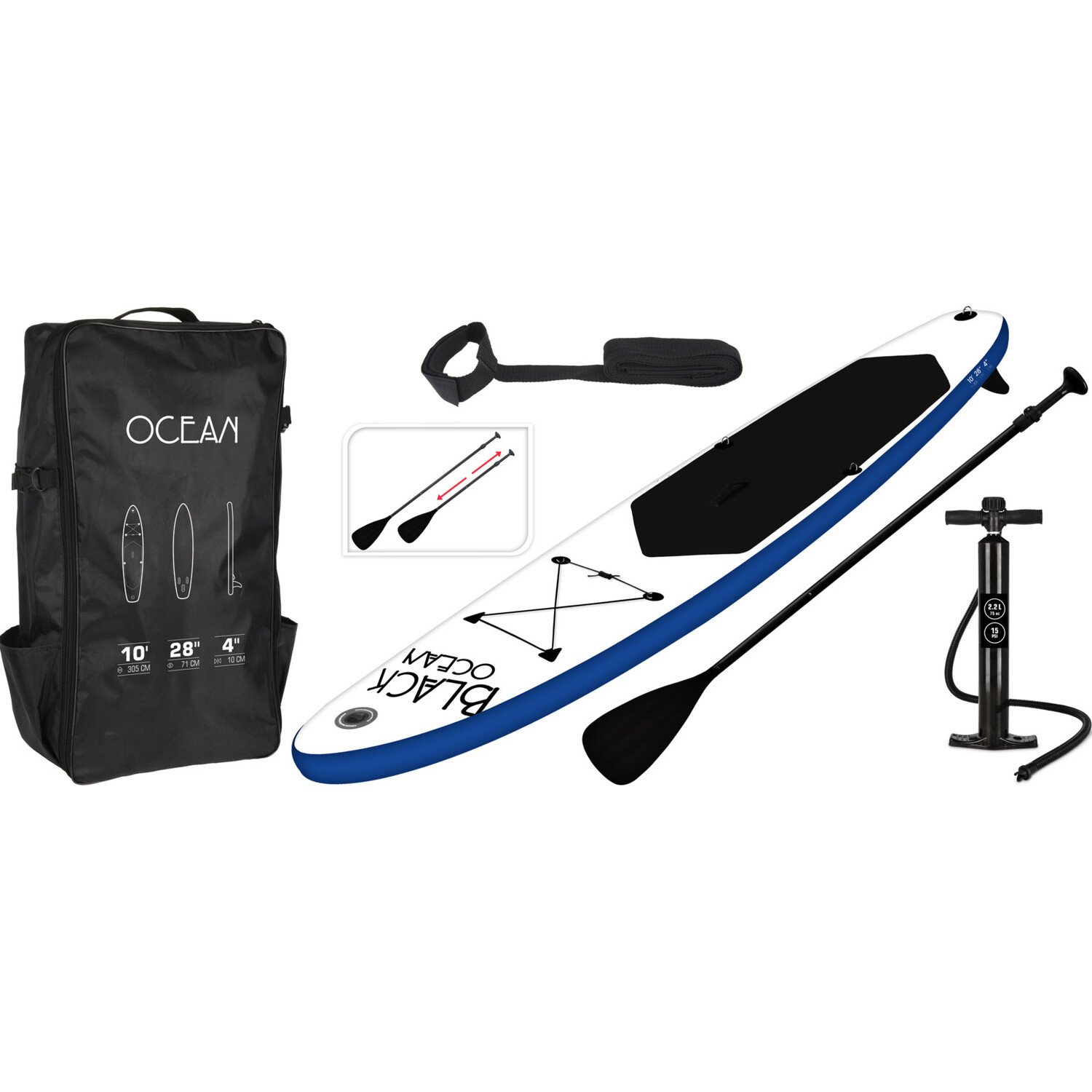The SUP 305 Black Ocean paddleboard is an exceptional product that offers both functionality and style. It's built with high-quality materials, giving it the strength and durability necessary to withstand the rigours of frequent use. The board comes with a paddle, leash, repair kit, and pump with a PSI meter, making it easy to inflate and repair. One of the standout features of this board is the rings that allow you to attach a chair, enabling you to paddle in comfort. The board is also equipped with a convenient carry bag that makes it easy to transport and store, allowing you to take it with you wherever you go.