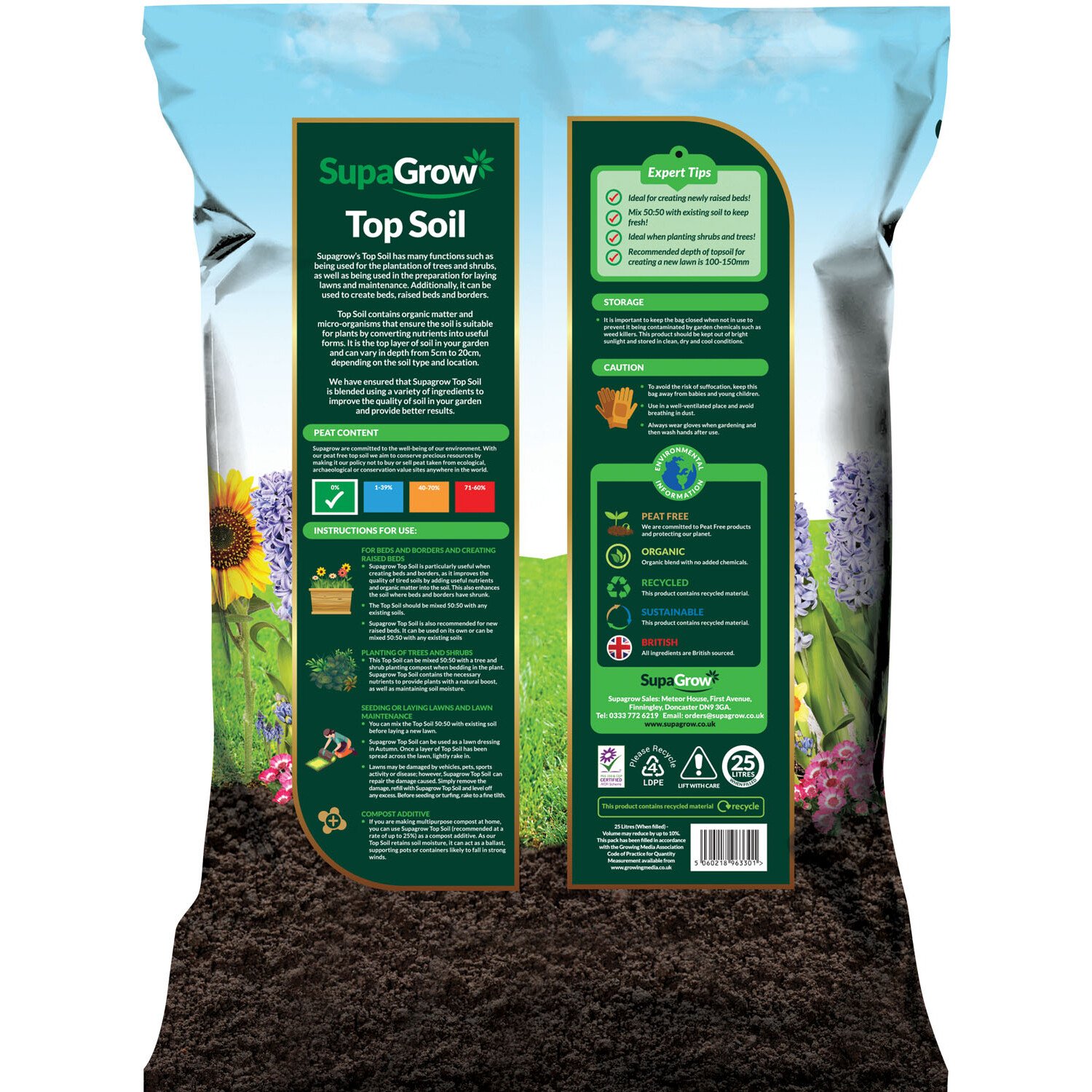 Nurture your garden's growth with this SupaGrow Premium Blended Top Soil. Peat-free and 100% organic, this lightweight soil is a must-have item for any passionate gardener. Perfect for any landscaping or garden projects, such as working on your beds and borders, this bag promotes root growth while retaining moisture and guarantees improved soil fertility.