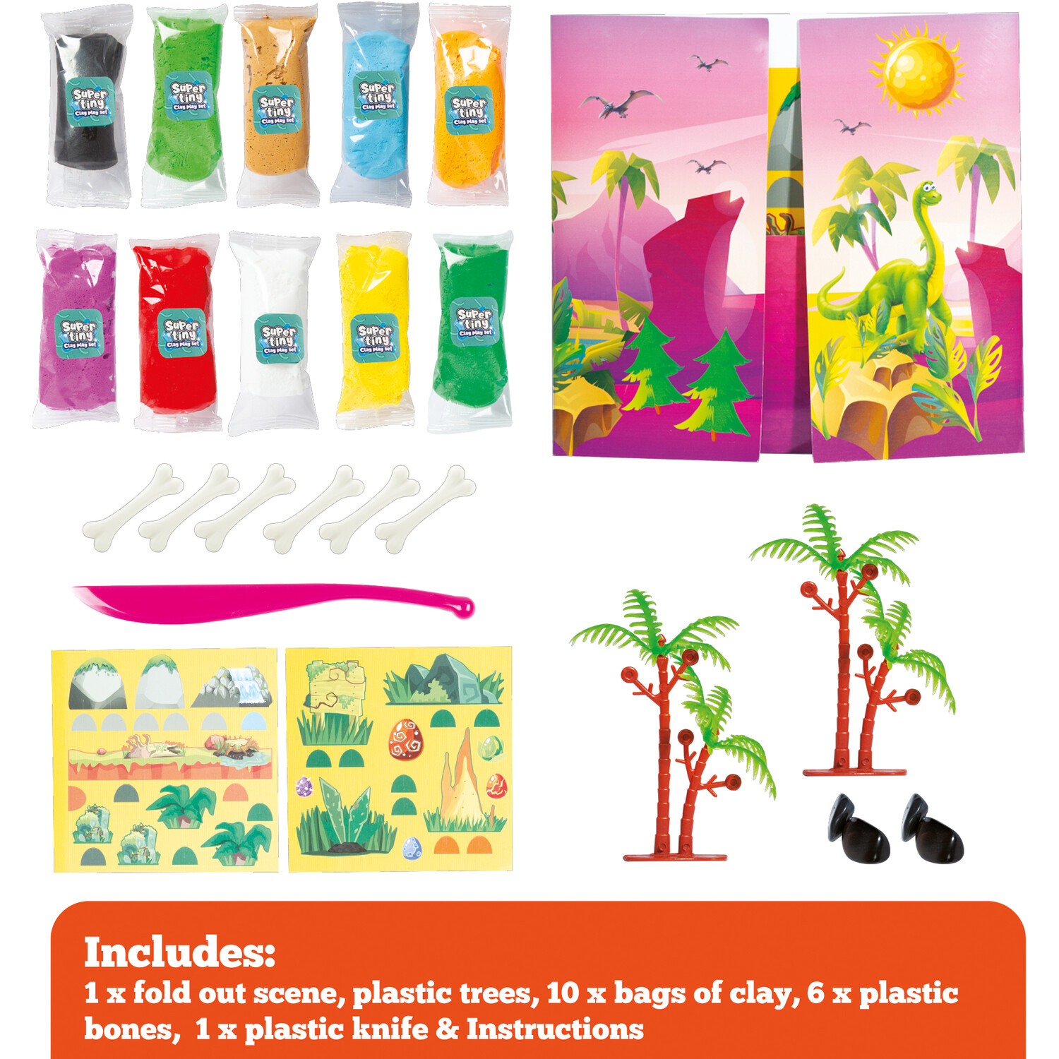 Create your very own dino world with the Super Tiny Clay Play Set. Fun and creative, this set includes all you need, so all your little one has to do is set their imagination free. Simply let the kids mould the colourful clay into little dinosaurs and assemble all the pieces together to bring the tiny pre-historic scene to life.