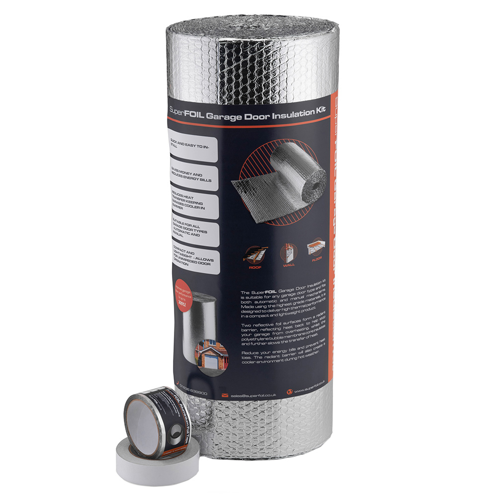 Keep the garage warm in winter and cool in summer with SuperFOIL Garage Door Insulation Kit. Suitable for any garage door type - it fits both automatic and manual mechanisms. Made using the highest grade materials, it is designed to deliver high thermal performance in a compact and lightweight product. The two reflective foil surfaces form a radiant barrier, reflecting heat back to either prevent heat loss during winter or help stop your garage from overheating in summer. The durable polyethylene bubble membrane core insulates and further slows the transfer of heat. It contains all the material and tapes needed to insulate one standard-sized garage door. The SuperFOIL garage door insulation kit controls temperatures to create a comfortable environment all year round.