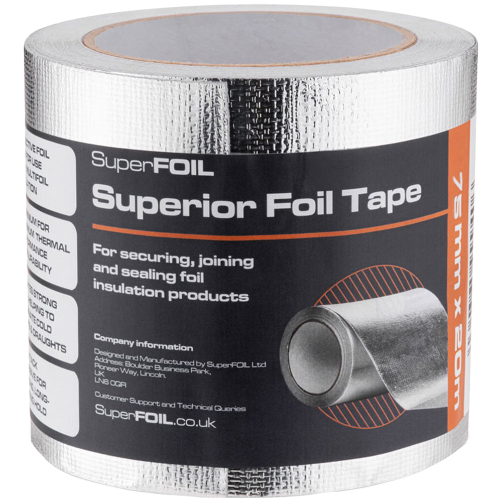 SuperFOIL Superior Foil Tape is a glass fibre reinforced tape, suitable for use with all SuperFOIL products. Ideal for sealing overlaps and joints to reduce cold air penetration. Its application enhances the insulation performance and efficiency of the multifoils and is quick and easy to use even in cold temperatures.