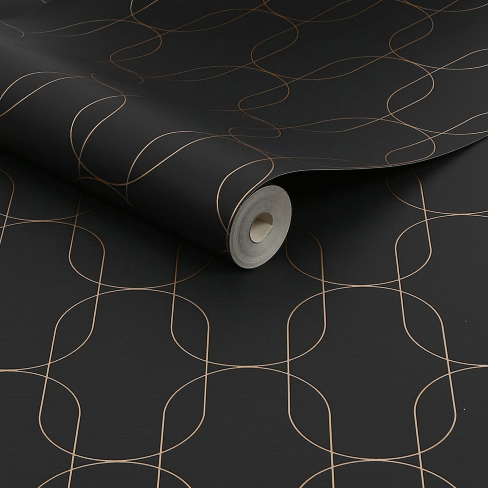 Give a fresh contemporary touch to your home decor with Superfresco Colours Eternity Black and Gold Wallpaper. This geometric wallpaper features a splendidly elegant textured paper that incorporates bands of gold in a squoval shape. Embossed on a vivid teal background - it is ideal for adding a touch of depth and charm to a feature wall. The roll length is 10m, the width is 52cm, and the design repeat is 21.33cm. Application: Paste the paper. Design match: Straight.