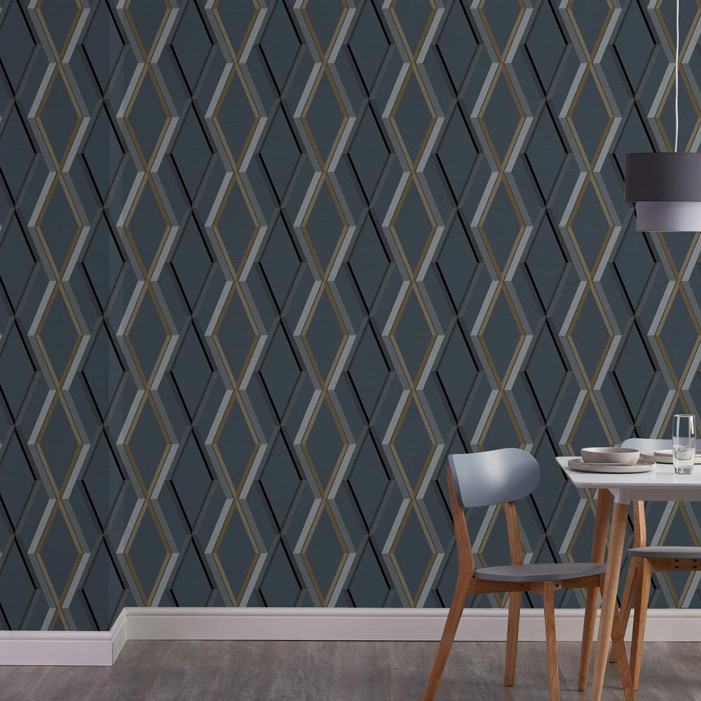 Make a statement in any room with the Superfresco Easy Prestige Geo Navy wallpaper. This diamond shape geometric design has a bold symmetry that is embellished with bold metallics. Application: Paste the Wall. Design Match: Straight. Design Repeat: 64cm. Roll Length: 10m. Roll Width: 52cm