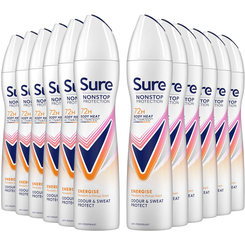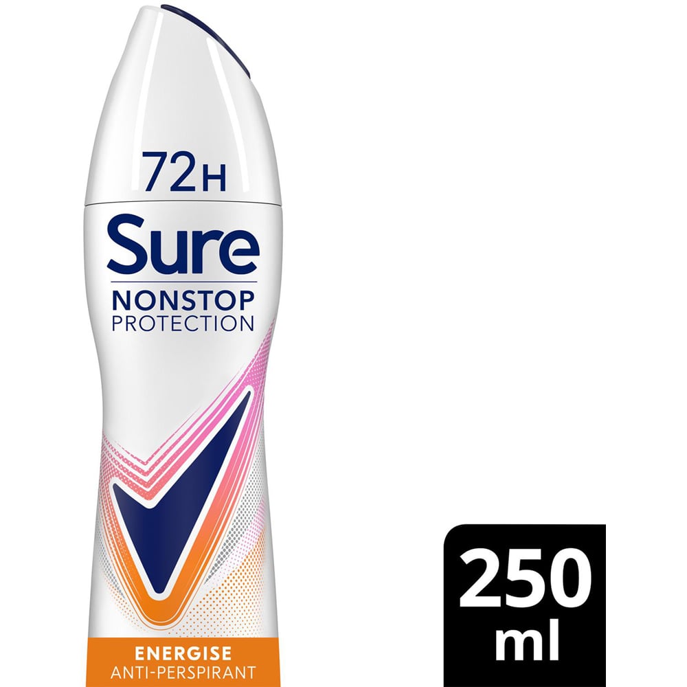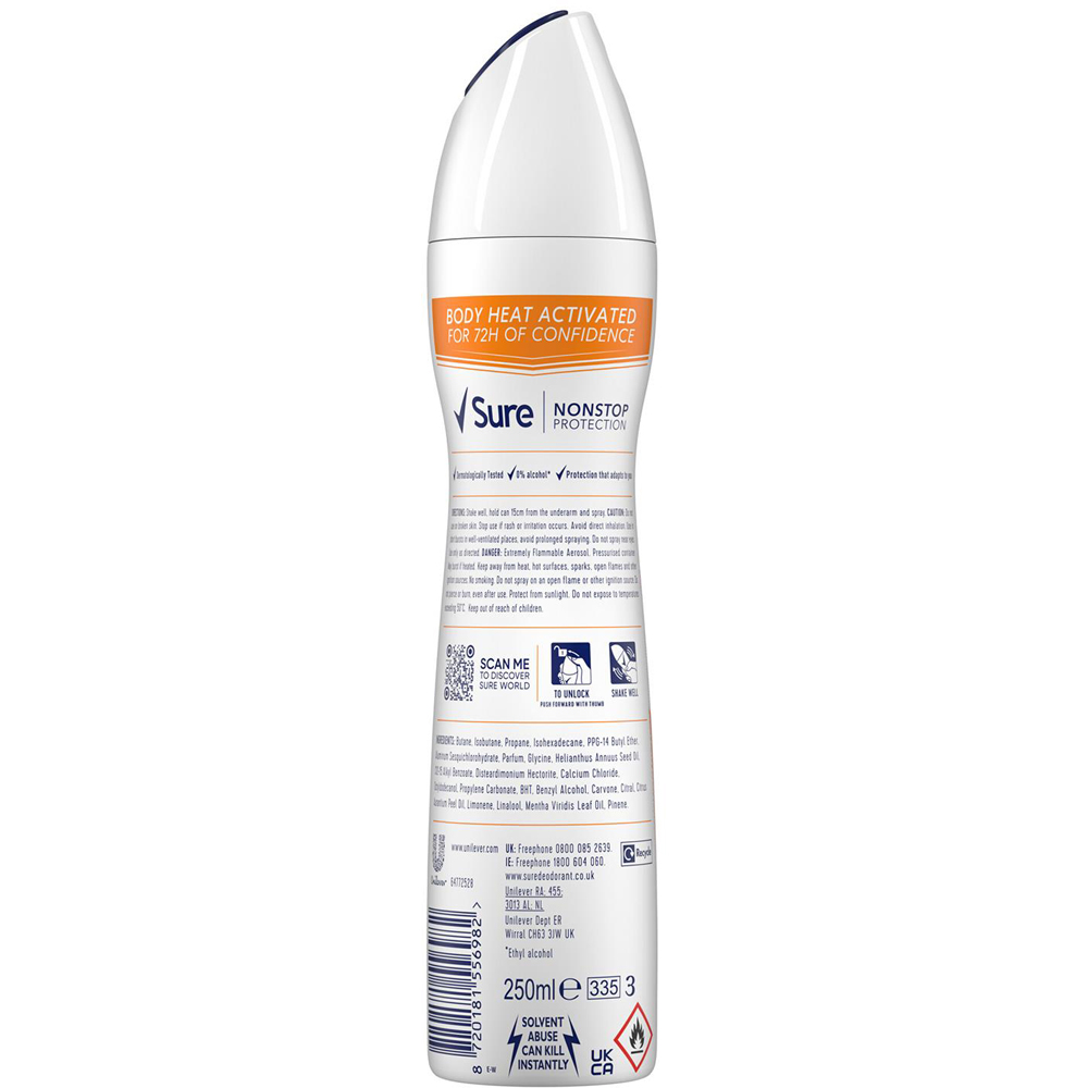 Sure Women Nonstop Protection Energise Anti-Perspirant Aerosol Deodorant offers 72 hours of continuous defence against sweat and odour, ensuring you’re always prepared to keep going. Its alcohol-free formula keeps your underarms feeling clean, fresh, and dry throughout the day without irritating. This women's Anti-Perspirant deodorant utilises Sure's innovative Body Heat Activated technology, which works effectively when temperatures rise, creating a robust protective barrier as your body heat increases and providing you with unwavering confidence paired with a revitalising mandarin and mango fragrance. Whether you're supporting your favourite team, enjoying a vigorous day out, or simply hanging out with friends, this women's deodorant spray will provide you with all the support needed. When you put in the effort, you can count on Sure to do even more. The Anti-Perspirant containers are crafted from infinitely recyclable aluminium. Please remember to recycle.