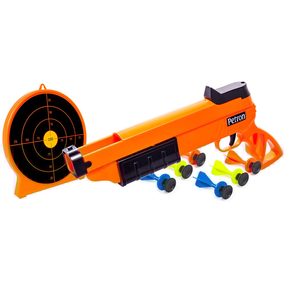 The Petron Sureshot Pistol and Target Combo Pack includes the Sureshot Pistol, Sureshot Target and 6 Sureshot sucker darts. The Petron Sureshot Pistol shoots the super safe Sureshot sucker darts, and it is ideal for ages eight and above. The safety trigger ensures the pistol can only shoot when loaded with a Petron sucker dart. With a front and rear sight, the pistol is remarkably accurate. Made from very strong plastic, it is lightweight and equally suitable for shooting indoors and outdoors. Supplied with six Sureshot sucker darts. The Petron Sureshot Target can be used with all Petron sucker dart products. Wall hanging and integral fold-out legs for standing on any flat surface. 25cm diameter.