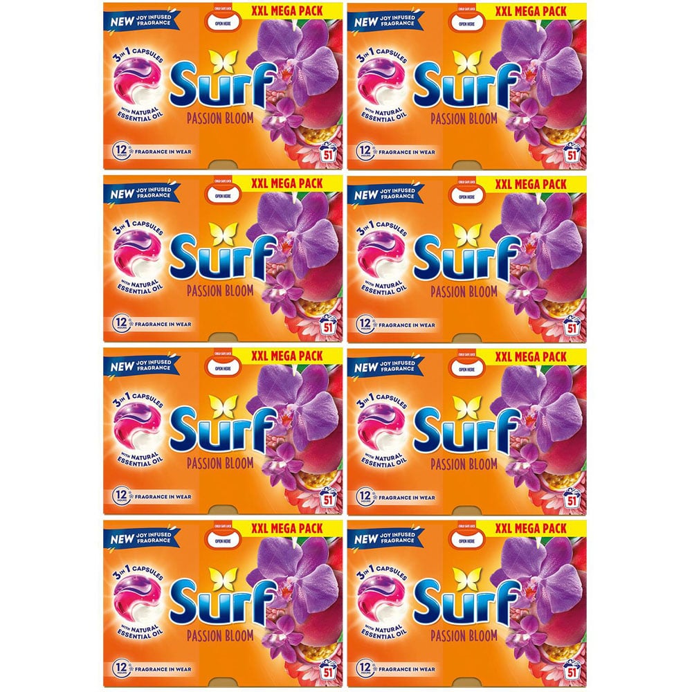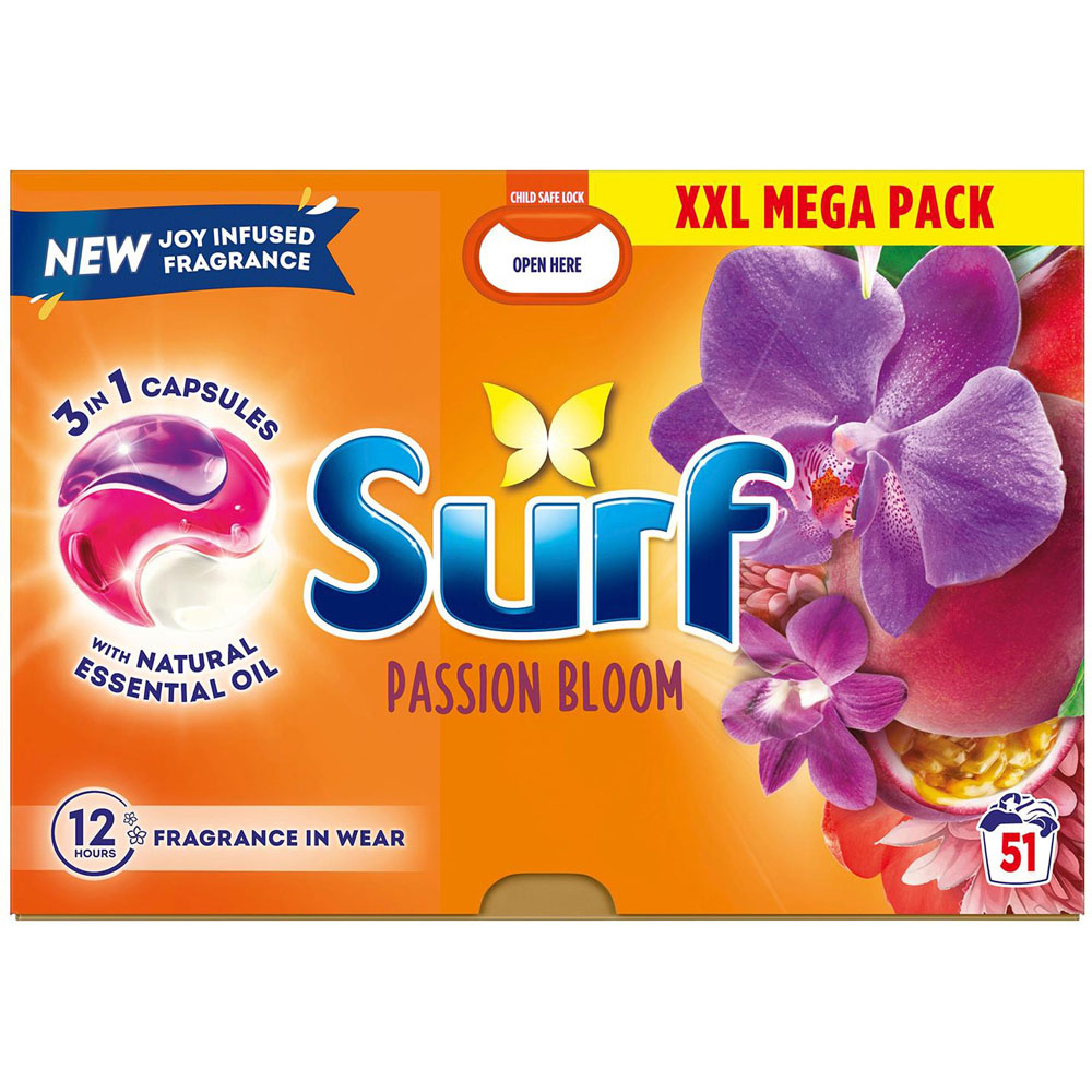 Surf 3 in 1 Laundry Washing Detergent Capsules Passion Bloom brings the sassy scents of passion fruit, flowers, mango and guava right into your laundry basket. With the joyfully jazzy blend of exotic flowers and natural essential oil, your clothes aren't just fresh, they are on a fragrance fiesta that lasts from dawn to dusk, giving you up to 12 hours of in-wear delight. These laundry detergent capsules dissolve fast even in quick and cold washes, delivering a brilliant clean with bursts of fabulous fragrance long after you've washed your clothes. You can rest assured your laundry will be brilliantly clean and fresh for longer with these dermatologically tested washing detergent capsules from the UKs No.1 fragrance detergent brand.