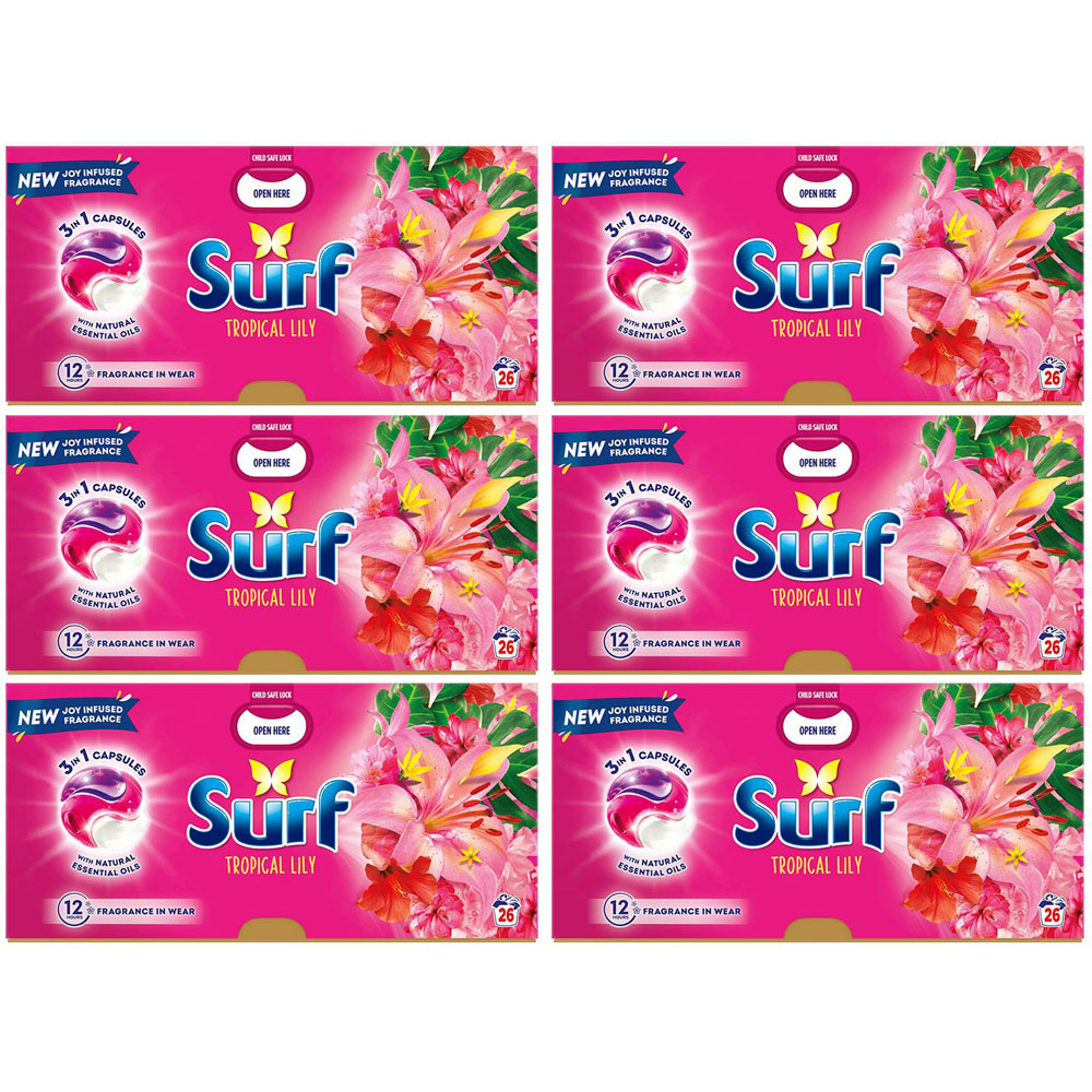 Surf 3 in 1 Laundry Washing Detergent Capsules Tropical Lily turns up the volume of joy in your day-to-day life, infusing your wardrobe with an explosion of floral sweetness that lasts from dawn to dusk. Power of long-lasting tropical lily scent, infused with essential oils for up to 12 hours of in-wear delight. These laundry detergent capsules dissolve fast even in quick and cold washes, delivering a brilliant clean with bursts of fabulous fragrance long after you've washed your clothes. You can rest assured your laundry will be brilliantly clean and fresh for longer with these dermatologically tested washing detergent capsules from the UKs No.1 fragrance detergent brand. Surf laundry capsules are easy to use, being both efficient and convenient for your busy life, and the box is recyclable and plastic-free.