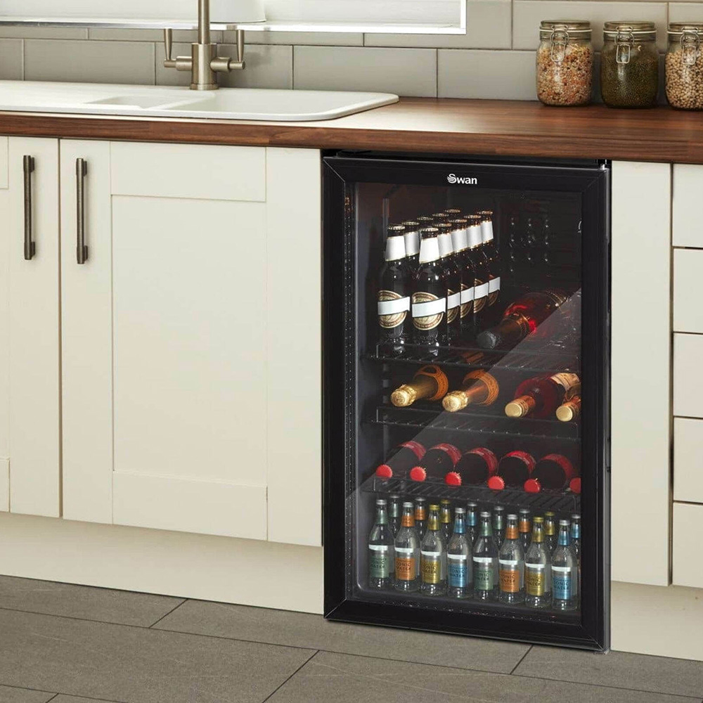 Enjoy the perfect blend of form and function with this Swan Black 80L Undercounter Fridge. This compact yet spacious fridge features a sophisticated glass door, making it perfect addition to any space. With an adjustable thermostat, you can easily control the temperature to suit your needs, while the soft interior light ensures you can always find what you are looking for. The reversible door design offers flexibility in placement, making it convenient for any setup.
