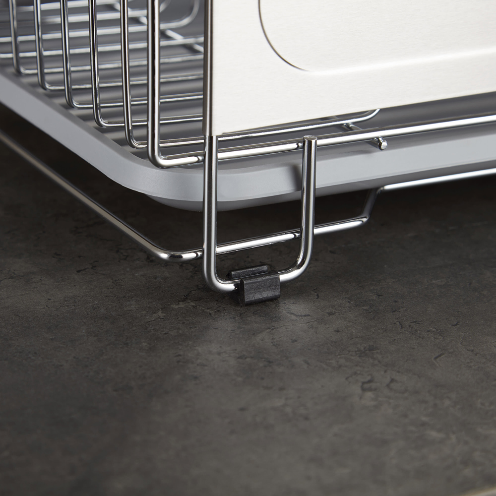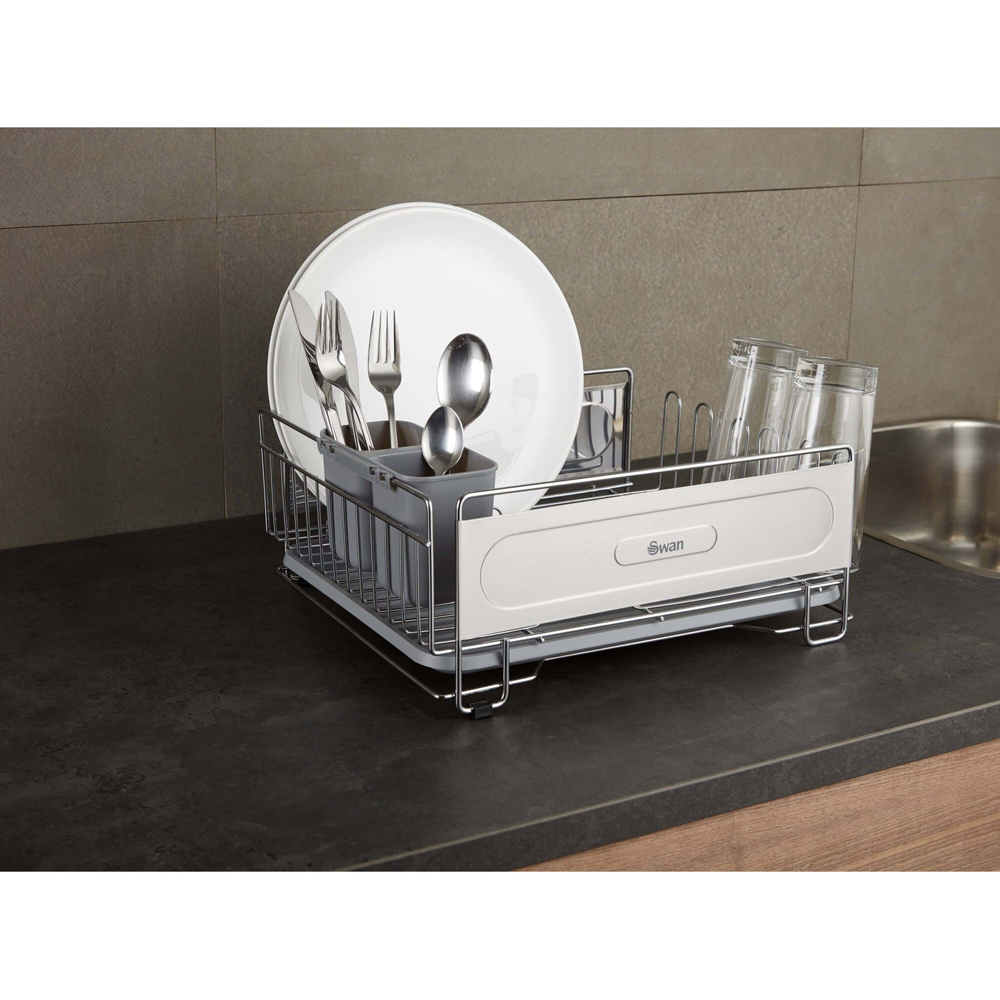 Effortlessly organise your kitchen chaos with this Swan Chrome Dish Rack. This chrome rack is an incredibly convenient place to dry off your dishes and comes with two detachable utensil holders. Fits perfectly onto kitchen countertops or draining boards and features a durable chrome wire structure with anti-slip feet for stability.