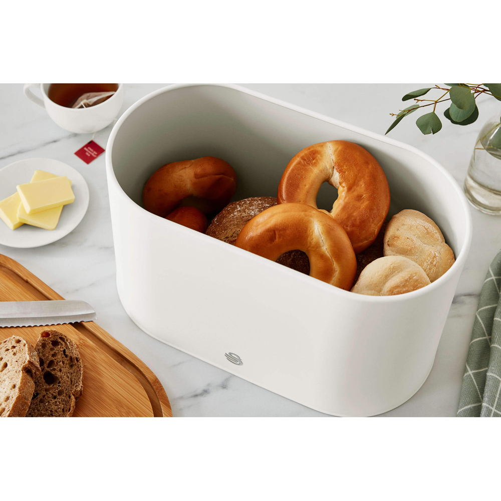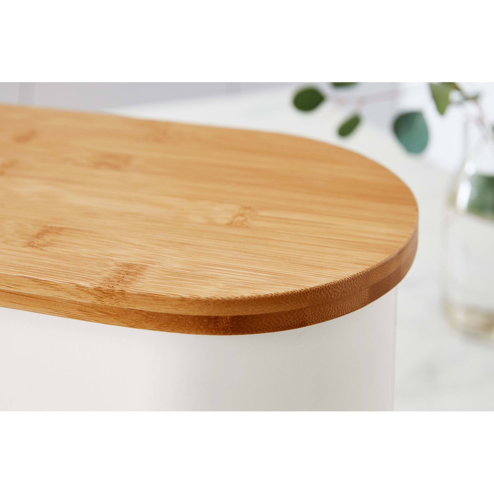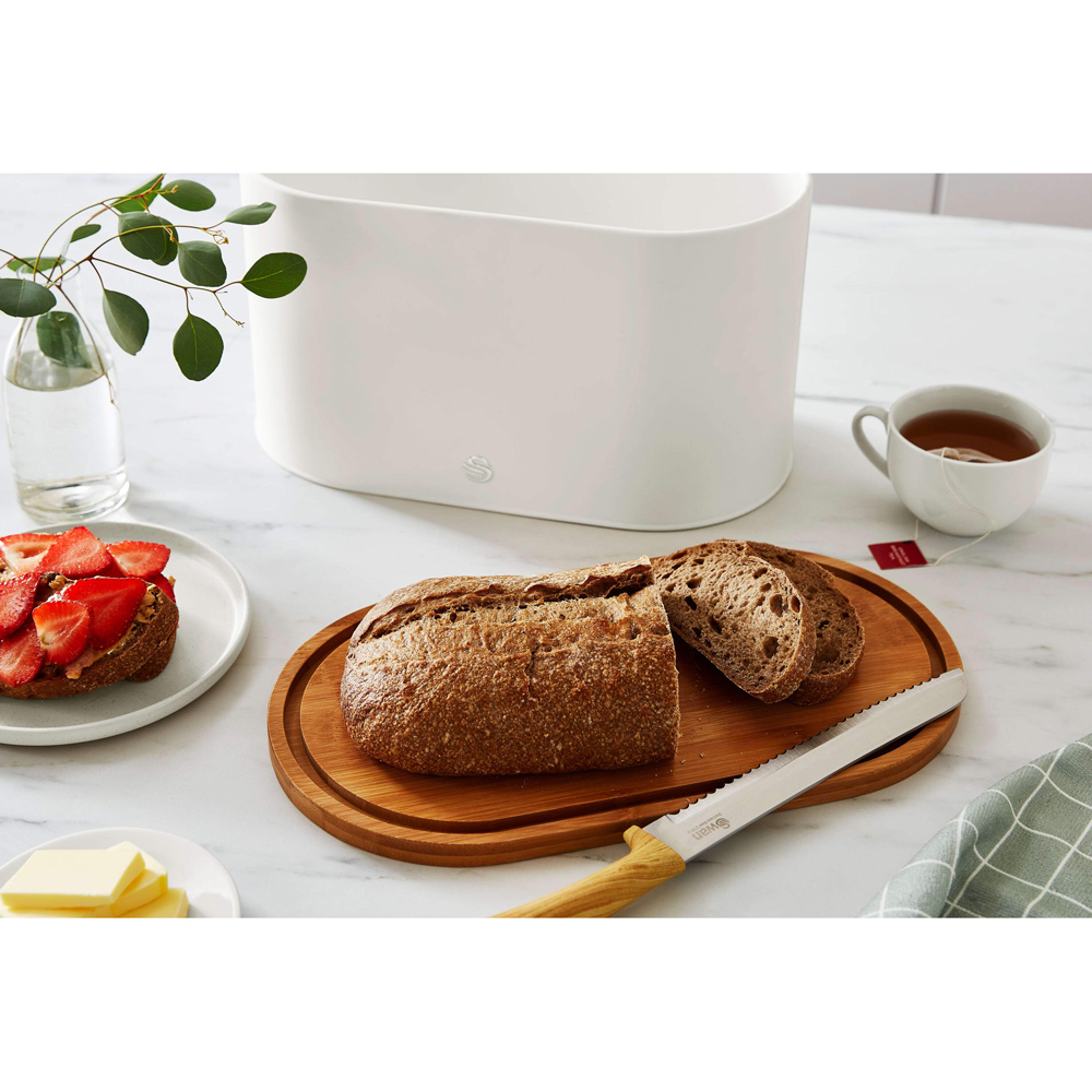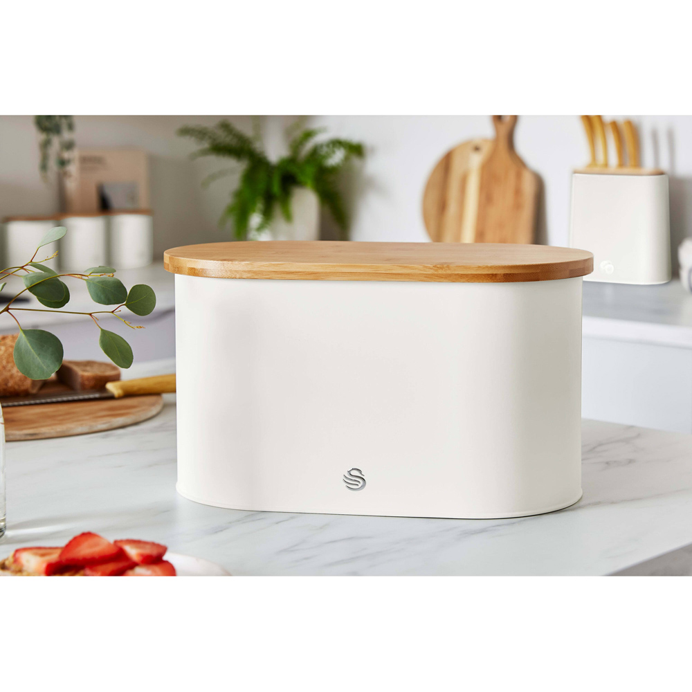Store your bread or other items with this Bread Bin with a wooden Lid by Swan. This bread bin is inspired by a Scandinavian minimalist design and comes in a soft touch cotton white colour with a bamboo cutting board lid. It is made from durable carbon steel and is designed to keep your loaves, cakes and pastries fresher for longer. With a generous capacity and measuring H34.5 x W18.5 x D16.5cm, it's the ideal choice for storing large quantities of baked goods.