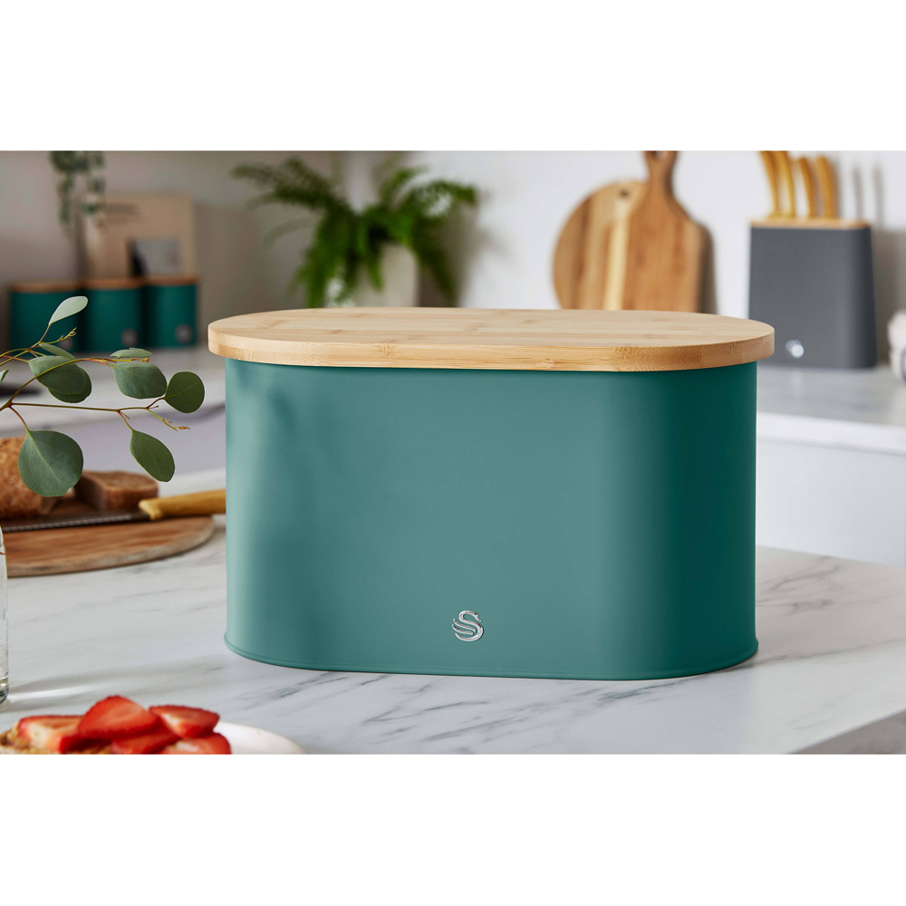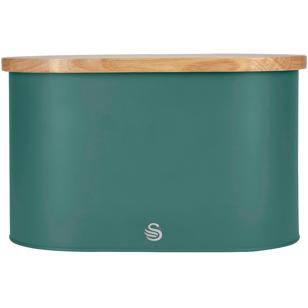 Store your bread or other items with this Bread Bin with a wooden Lid by Swan. This bread bin is inspired by a Scandinavian minimalist design and comes in a soft touch pine green colour with a bamboo cutting board lid. It is made from durable carbon steel and is designed to keep your loaves, cakes and pastries fresher for longer. With a generous capacity and measuring H34.5 x W18.5 x D16.5cm, it's the ideal choice for storing large quantities of baked goods.