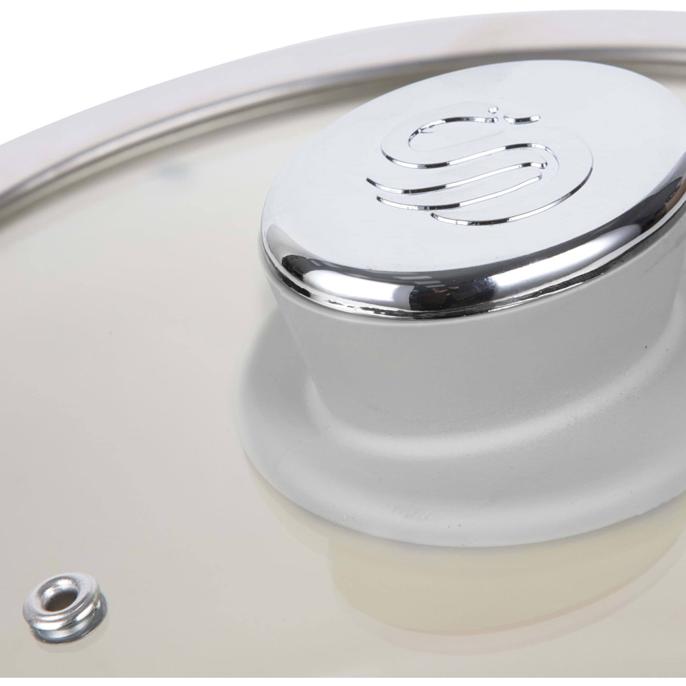 Add a versatile option to your kitchen with this Retro Pan Set by Swan. This grey-coloured five-piece pan set lets you create various dishes for one person or family. The set features 16cm, 18cm, and 20cm saucepans complemented by 20 and 28cm frying pans. The pans have a ceramic ivory non-stick inner coating that requires little to no oil for healthier cooking and an easy clean. A 3mm, heat-resistant pressed aluminium body offers durability and a soft touch; stay cool Bakelite handles make them safe and comfortable to use and carry. This set is suitable for all hob types, including induction; it is completed with tempered glass lids and a stylish rib-designed body and requires only a simple hand wash to maintain.