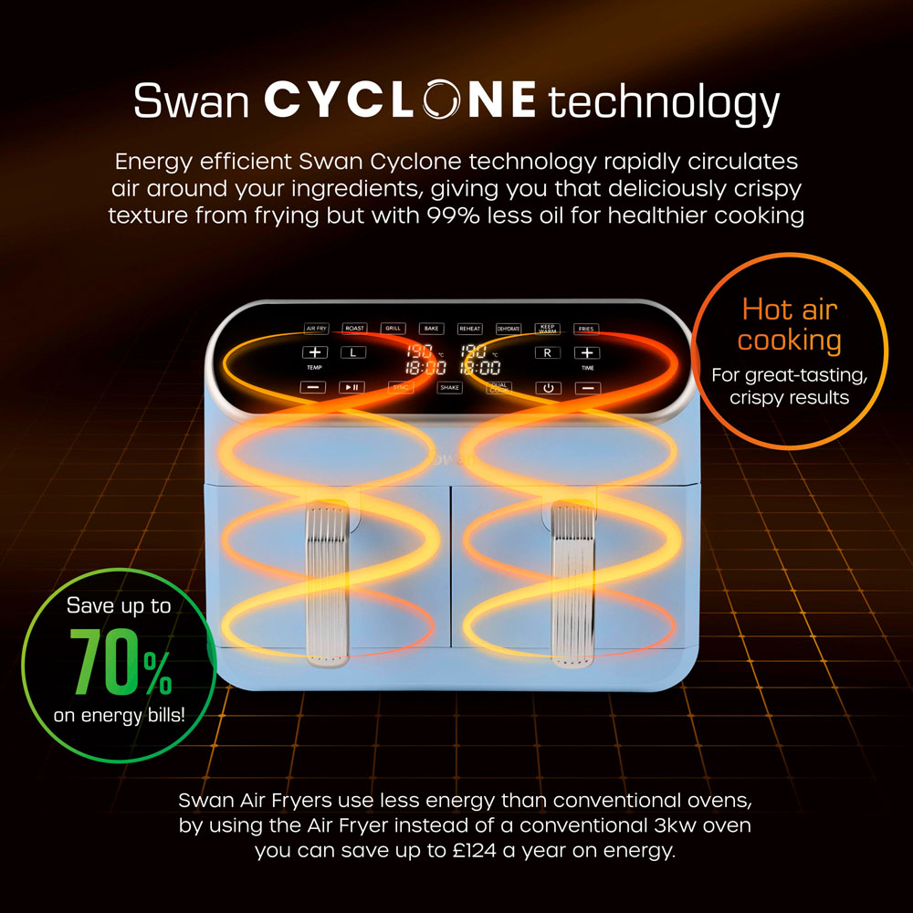 This Swan SD10519BLU Retro blue dual basket digital air fryer is an energy saving alternative to oven cooking. Swan Cyclone Technology creates crispy fried meals with minimal oil needed for healthier results. Features 8 pre-set functions for Fries, Bake, Roast and more. Smart Sync Finish cooks both baskets at once on different times and temperatures but will finish at the same time. Includes shake reminder to keep your food cooking evenly and consistently. The Swan Retro collection is inspired by 1950s and 1960s design to compliment all kitchen decors.
