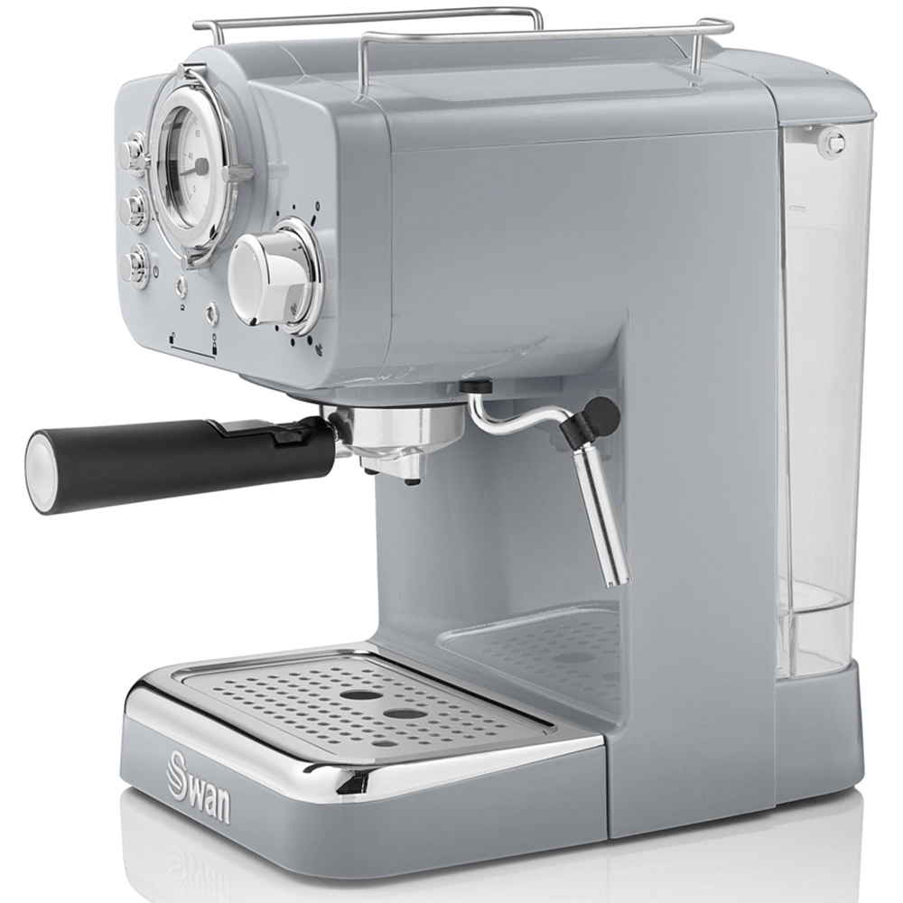 Start your morning the right way with a delicious barista style coffee using the Swan Retro espresso coffee machine. It features a large 1.2 litre water tank, with 15 bars of pressure to bring out the full flavour for a delicious espresso, coffee, latte, cappuccino, or flat white. Compatible with Easy Serve Espresso (ESE) pods and ground coffee. Includes a measuring spoon, coffee presser and built-in milk frother with steam settings to create the perfect latte or cappuccino. It's cafe-quality premium coffee, without the premium price tag.