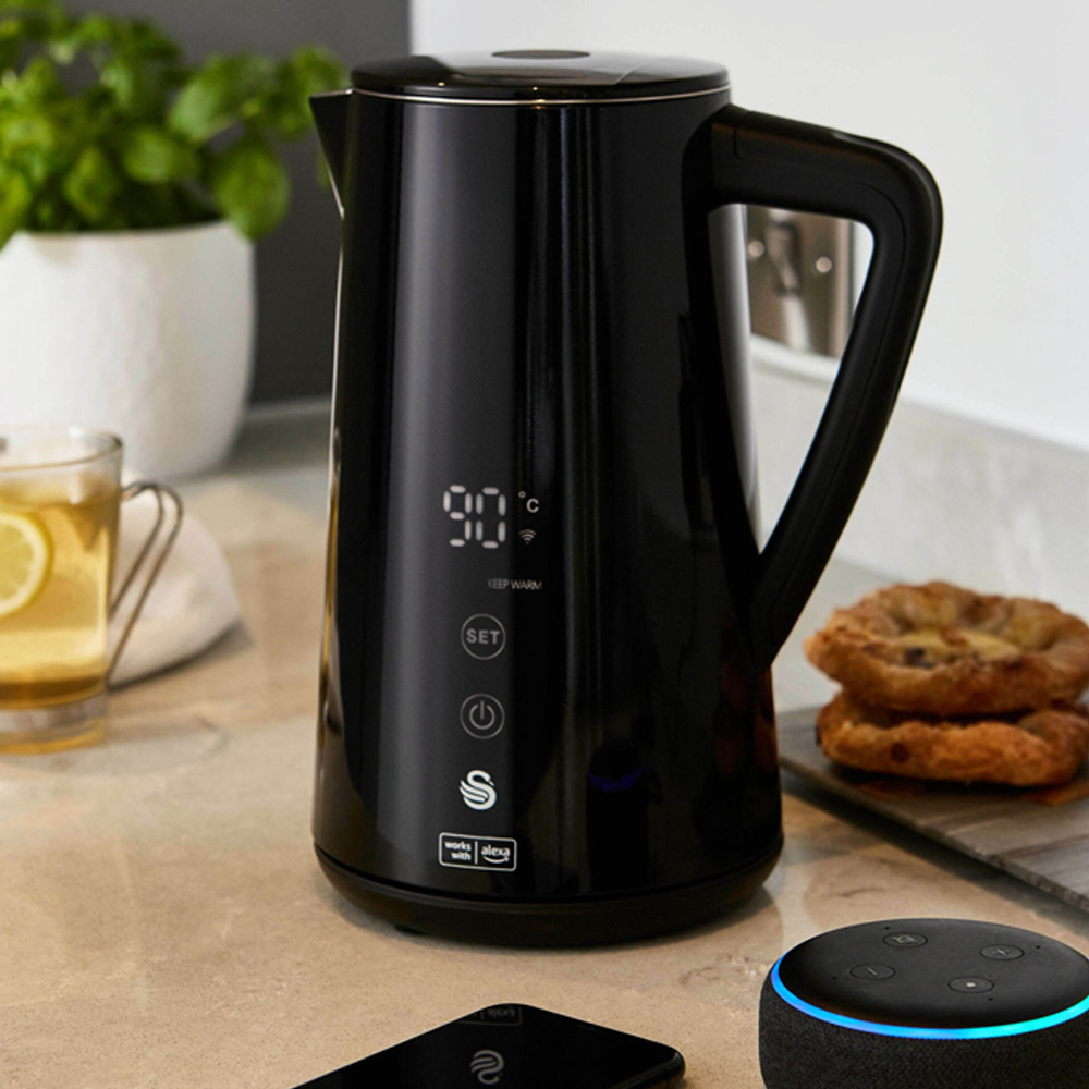 Elevate your kitchen in style with the Swan Black Smart Kettle. This voice-activating kettle works with smart features and brings the perfect brew to life with your voice. Thanks to its rapid boil element, you can enjoy a brew in no time and top up drinks with its auto two-hour keep warm function. Also, its double-walled exterior keeps the outside cool to the touch while retaining heat within to reduce the need for further boiling. If you or guests enjoy speciality teas, you'll love the four temperature options this kettle offers for users. With its cordless base, cord storage, and dry boil protection, there's no need to worry about safety or cluttering your kitchen. Its stainless steel inner ensures durability, and its 1.5L capacity makes 8-10 cups from one boil. Finished with a black gloss finish and digital touch controls, this stylish, effortless kettle will be a cool addition to any kitchen. Add the kettle to your app, follow the instructions and enjoy the future of making hot drinks today. Power: 1800W.