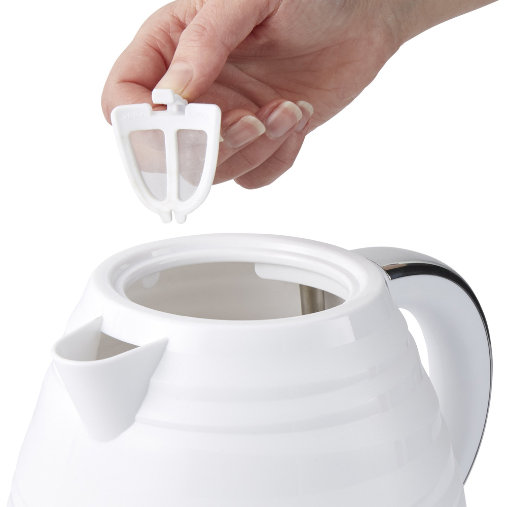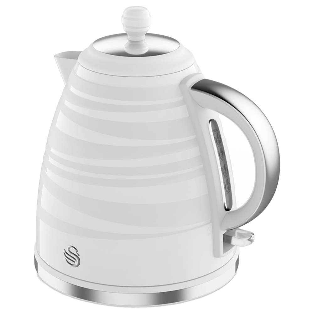 Pretty and practical, the Swan Symphony Jug Kettle in white will be a smart addition to any kitchen. Contemporary in style, it features a textured surface, decorated with a distinctive, ribbon-style design in a high gloss and matt finish. Combining elegance with efficiency, it has a generous 1.7-litre capacity and can make up to six to eight cups with just one boil. The external water gauge allows you easily view how much water is in your kettle and the 360-degree rotational base means that your kettle it's always within easy reach whether you are right or left-handed. The removable, washable limescale filter helps ensure clean, fresh water every time, while keeping your kettle clean and free from limescale and other impurities. A concealed heating element ensures optimum efficiency along with automatic cut-out and boil-dry protection. The Kettle also comes with a 2-year warranty.