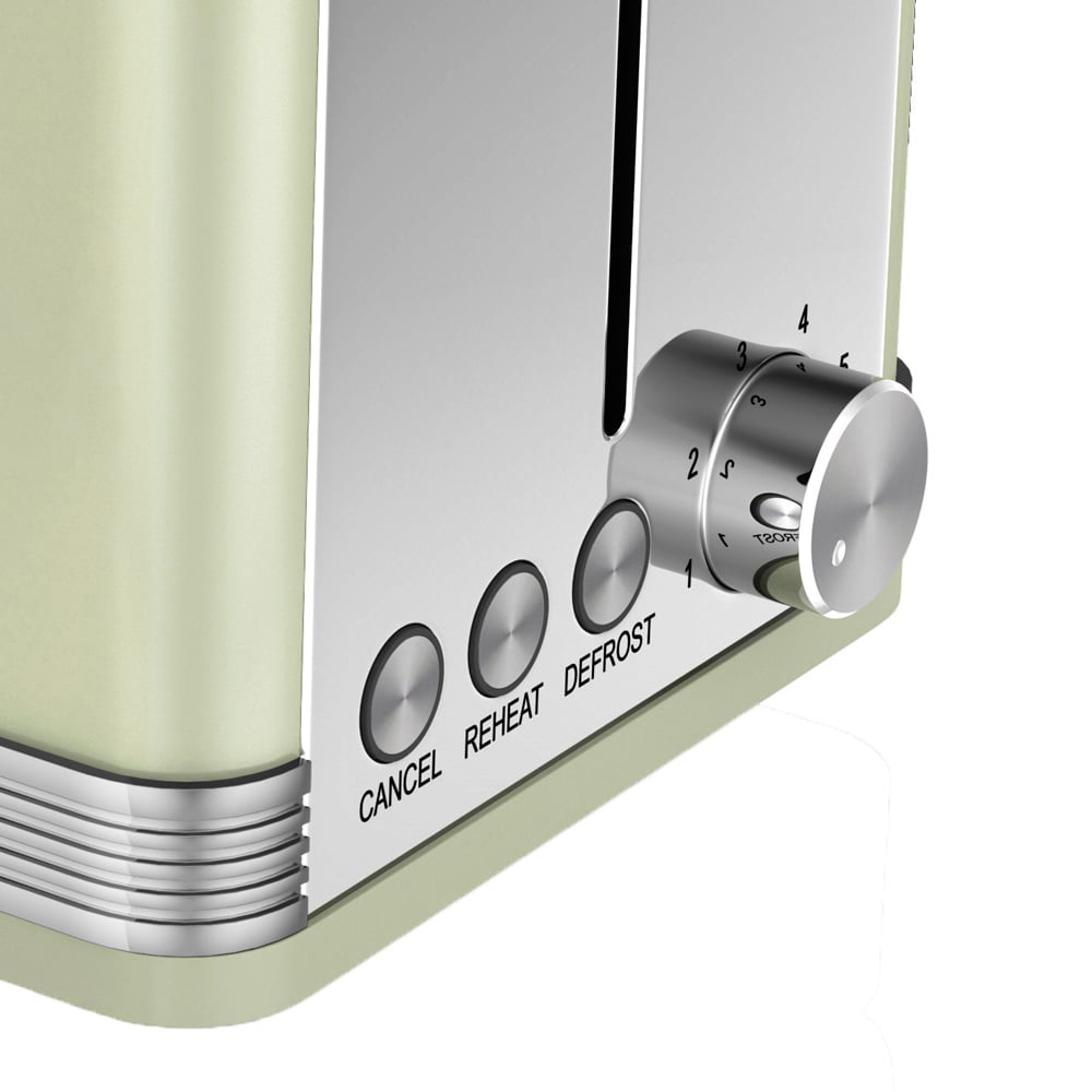 Enjoy your morning toast just the way you like it with this Swan Green 2-Slice Retro Toaster. The toaster comes with an adjustable knob for six levels of browning to help you make the perfect slice of toast. Also, it features cancel, reheat, and defrost functions for ideal results. Easy to use, the toaster comes with a slide-out crumb tray that helps keep your kitchen clean and mess-free.