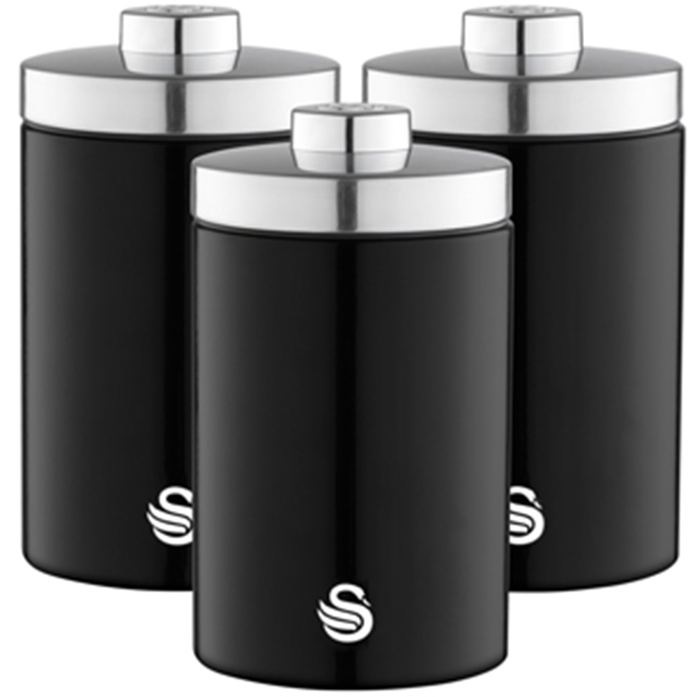 Swan Townhouse EEJB280 Black Bread Bin with 3 Piece Canister Set