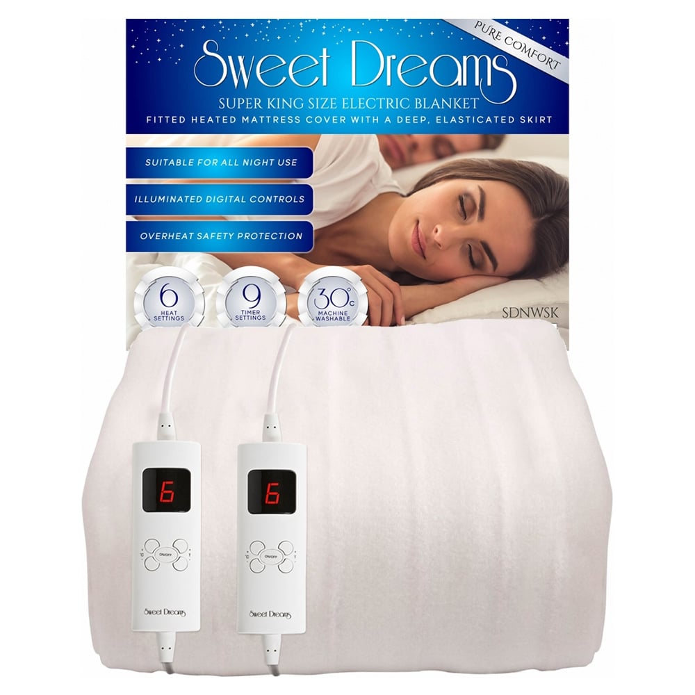Enjoy a relaxed and comfortable sleep with Sweet Dreams Super King Fitted Blanket. Designed using only the best, high-quality material, this blanket ensures resilience and durability for years. Super comfortable, these electric blankets feature ultra-thin, non-obtrusive wires and a deep, elasticated skirt that hugs your mattress tightly for ultimate relaxation. With six heat settings and nine timer settings, this blanket is perfect for keeping you as warm as you wish to be. Apart from this, they make a perfect all-year-round electric blanket, as you can adjust the temperature to suit your needs. The blanket comes with the finest safety measures so you can relax and drift off into a peaceful sleep. It has built-in overheat protection, automatic safety shut off and is completely safe for all-night use. Easy to wash, simply detach the removable controller and place the blanket in the washing machine at 30°c. The electric blanket comes in a useful, zip-up storage bag that is perfect for storing your blanket away during the warmer months. Size: 203 x 182cm.