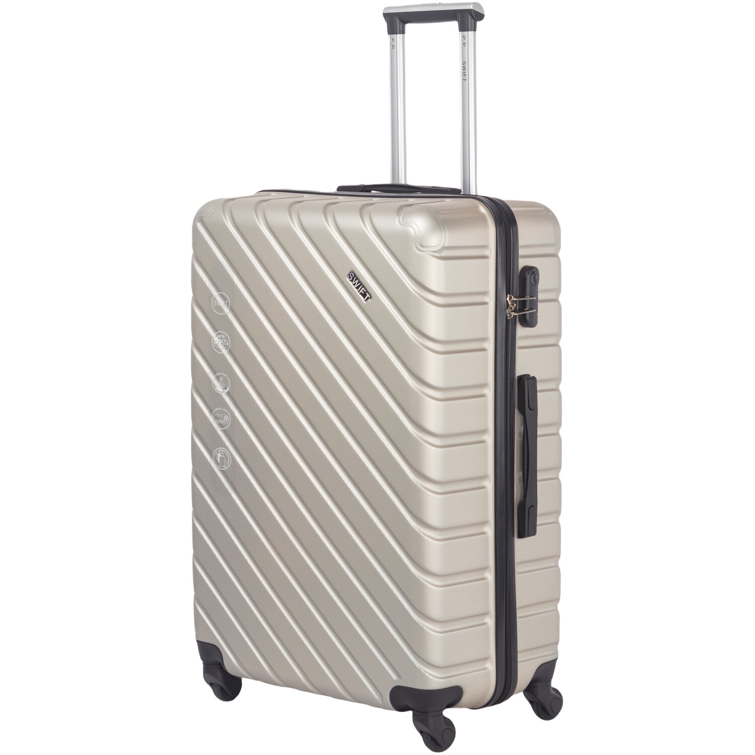 Introducing the Swift Astral Suitcase, the perfect travel companion for those who want to travel in style. This suitcase features a sleek and sophisticated design in either silver or beige, allowing you to make a statement wherever you go. With its easy-gliding wheel system and adjustable handle, navigating through busy airports is effortless. The durable plastic construction ensures that this suitcase will last for years, no matter how often you use it.