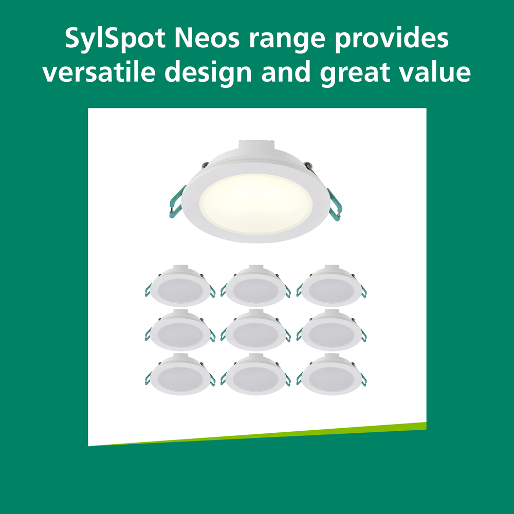 Upgrade your bathroom lighting with the Sylvania SylSpot Neos LED Spotlight. This pack of nine integrated LED accent spotlights offers a sleek and modern look with an ultra-low profile of 35mm, perfect for bathrooms. These spotlights feature a fixed design with a frosted lens and a wide beam angle of 100°, providing even and uniform light distribution. With an IP65 rating, these spotlights are protected against dust and water, ensuring durability and reliability in humid environments. The cut-out of 68mm allows for direct replacement of most halogen spots installed in the market, making the Sylvania SylSpot Neos LED Spotlight a convenient and efficient choice for your bathroom lighting needs.