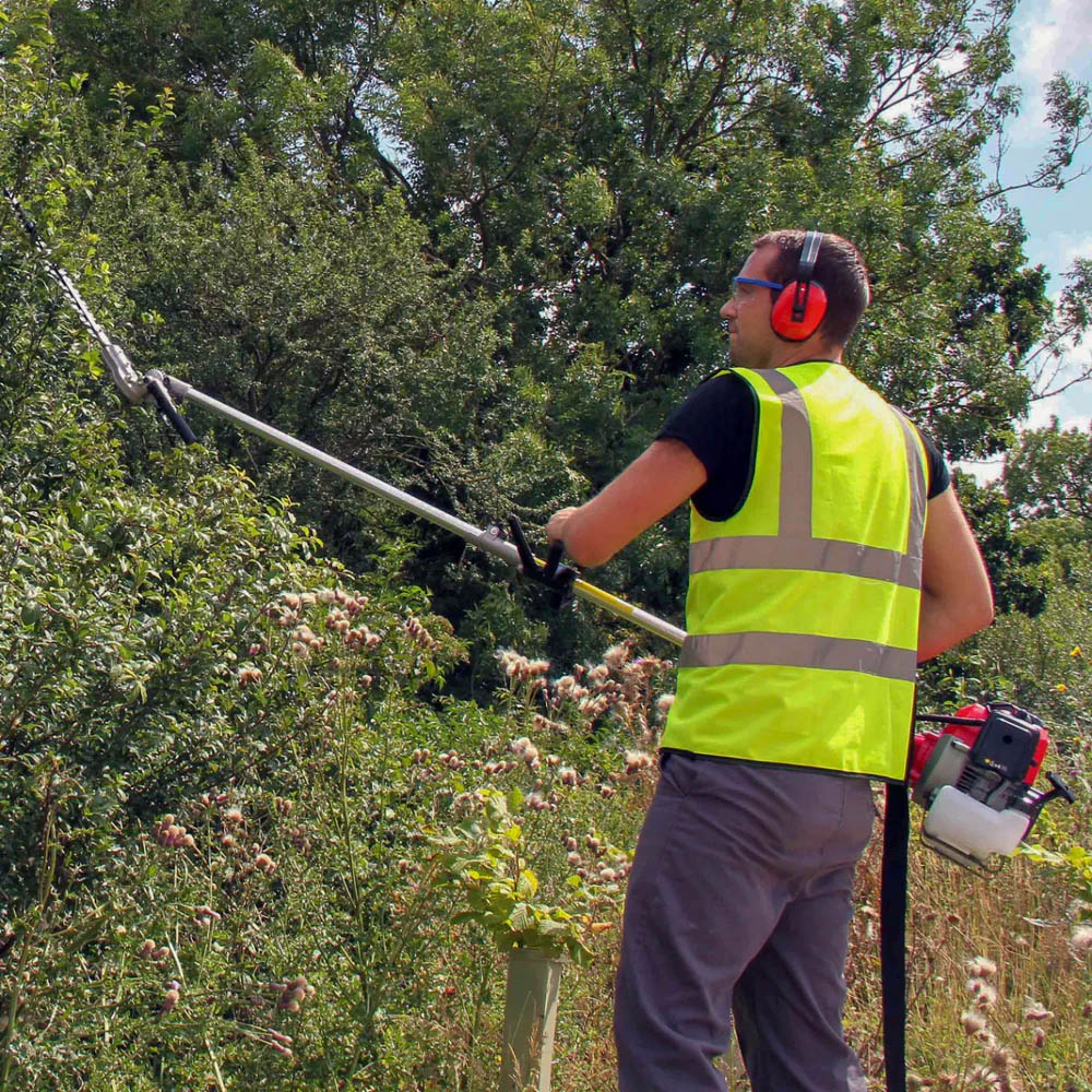 Transform your garden with the T-Mech 5 in 1 Garden Cutter Multi Tool 52cc. This versatile set is a powerful addition to your tool collection, equipped to handle all your gardening needs. The five attachments allow you to easily switch between a hedge trimmer, chainsaw, grass trimmer, brush cutter, and a 100cm extension pole. The hedge trimmer attachment features a sharp, double-edged steel blade and adjustable cutting angle, perfect for trimming bushes and hedges up to 24mm in diameter. It also comes with a protective cover for safe storage. The chainsaw attachment is ideal for pruning trees, tackling overhanging branches, and thinning treetops, and is also supplied with a protective cover. For lawn maintenance, the grass trimmer offers adjustable nylon wire to suit different cutting diameters, with the best result seen on grass around 15cm high. When facing tough foliage, the robust three-prolonged metal blade of the brush cutter can cut through weeds, shrubs, and nettles up to 13mm in diameter. A safety guard ensures added protection during use. The included 100cm extension pole offers enhanced reach for trimming hard-to-access areas, making this tool a reliable option for tasks big and small. With a high-performance 52cc two-stroke petrol engine, this multi-tool delivers professional-quality work. Its cordless design, 1.2L fuel tank, and lightweight construction provide exceptional portability for tasks of any size. The supportive shoulder strap ensures comfortable handling while the ergonomic handle allows for precise control. Switching between attachments is quick and easy with the practical tool kit. For safety, the set includes a comprehensive safety kit with gloves, ear defenders, goggles, and leg covers. Each attachment features protective covers for safe storage and use. The hedge trimmer is ideal for cutting hedges and bushes up to 24mm in diameter, while the chainsaw effortlessly prunes trees and trims overhanging branches. The grass cutter and brush cutter handle grass and tougher foliage, respectively, with adjustable features for varying diameters. The extension pole adds 100cm of extra reach for convenience.