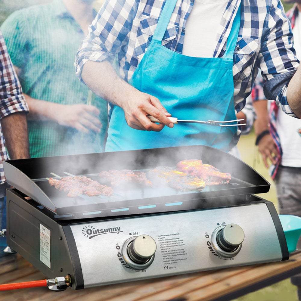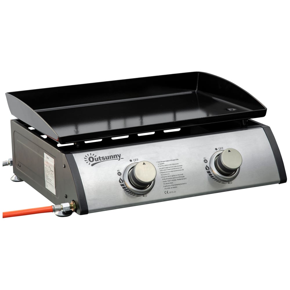 Enjoy cooking anywhere and anytime with this Outsunny Black and Silver 2-Burner Gas Tabletop Plancha Grill. This device is perfect for those times when you want your own hot food. With a two-burner design, the unit gives you two individual cooking areas for preparing a variety of meals. Also, each burner has 3 kW of power to ensure simple and efficient cooking. Easy to clean, the non-stick plate makes it simple to prepare your favourite dishes and wash them. The device comes complete with a grease-collection box and 2cm of adjustable feet. Size: 48.5 x 46 x 21cm. Keep your BBQ covered and protected with our range of premium BBQ covers.