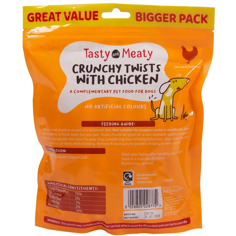 Made from chicken which contains no added colours, our natural dog treats are high in protein and low in fat, making a delicious and healthy complement to your dog’s diet. Ideal for dogs who love to chew their rewards, our twists are a strong treat that will keep your dog occupied for longer. Although they are suitable for adult dogs of most breeds and sizes, we do recommend that you supervise your dog at all times and ensure fresh water is available. These treats are easy to digest and delicious without any artificial colours and flavours. Rawhide (67%), Chicken, Glycerin, Salt.