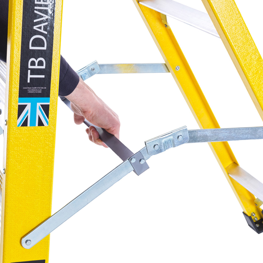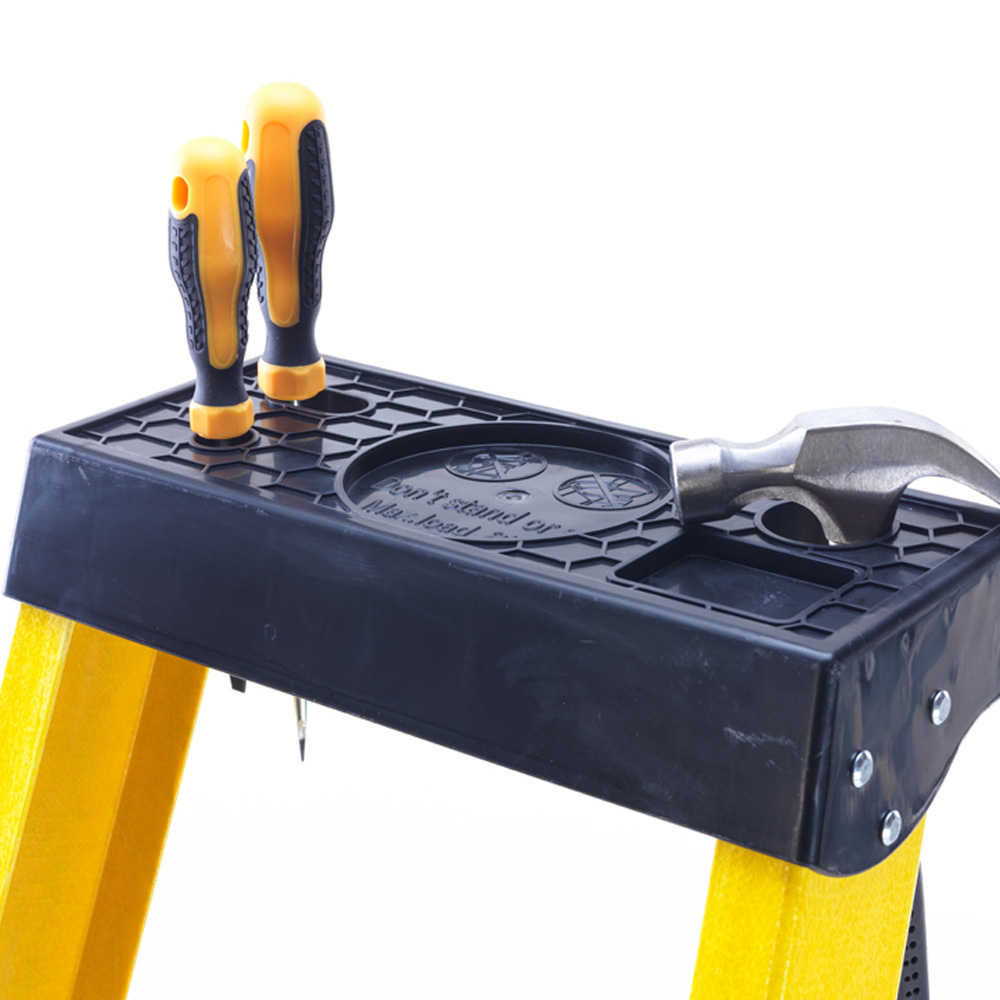 Get a variety of jobs done around the house with ease using TB Davies 5 Tread GRP Platform Step Ladder. The heavy-duty fibreglass step ladder incorporates a multi-functional tool tray with non-conductive stiles insulated to 30,000 volts, making them ideal for working around electricity. With the combination of super-strong C-section fibreglass stiles and reinforced aluminium treads gives you a durable yet lightweight step ladder. With easy-to-handle steps, it is perfect for the busy tradesman.