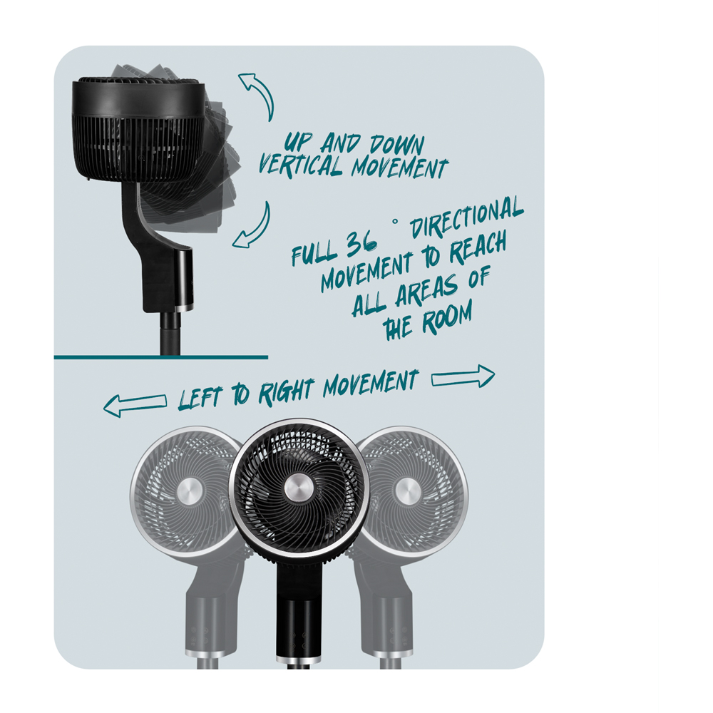 - 3D oscillation for full-room air circulation