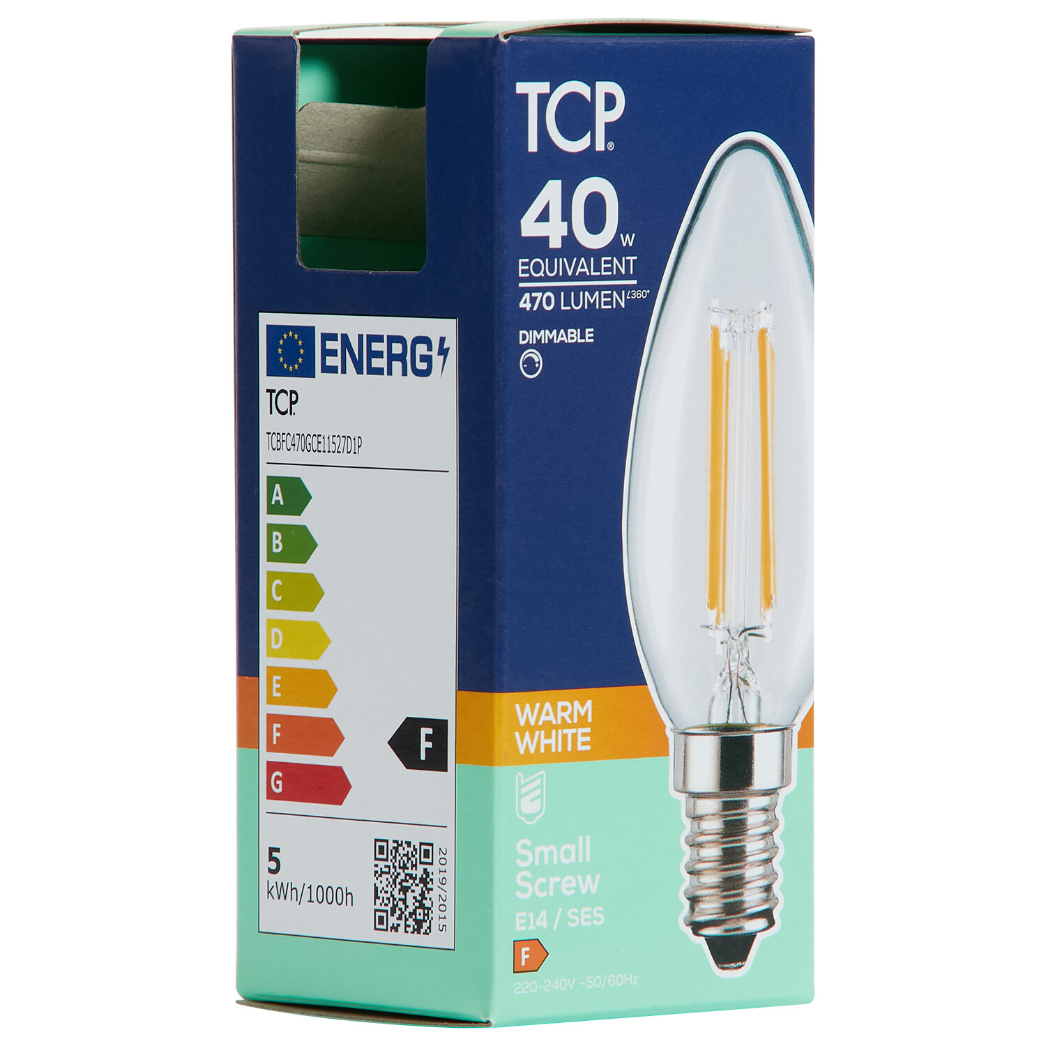 Add elegance to regular lighting with this TCP Filament Candle 470L E14 Dimmable Bulb. Featuring a vintage-inspired filament, this bulb offers a beautiful glow and adjustable brightness to suit any mood or setting. It is perfect for chandeliers, ceiling lights, decorative fixtures and more.