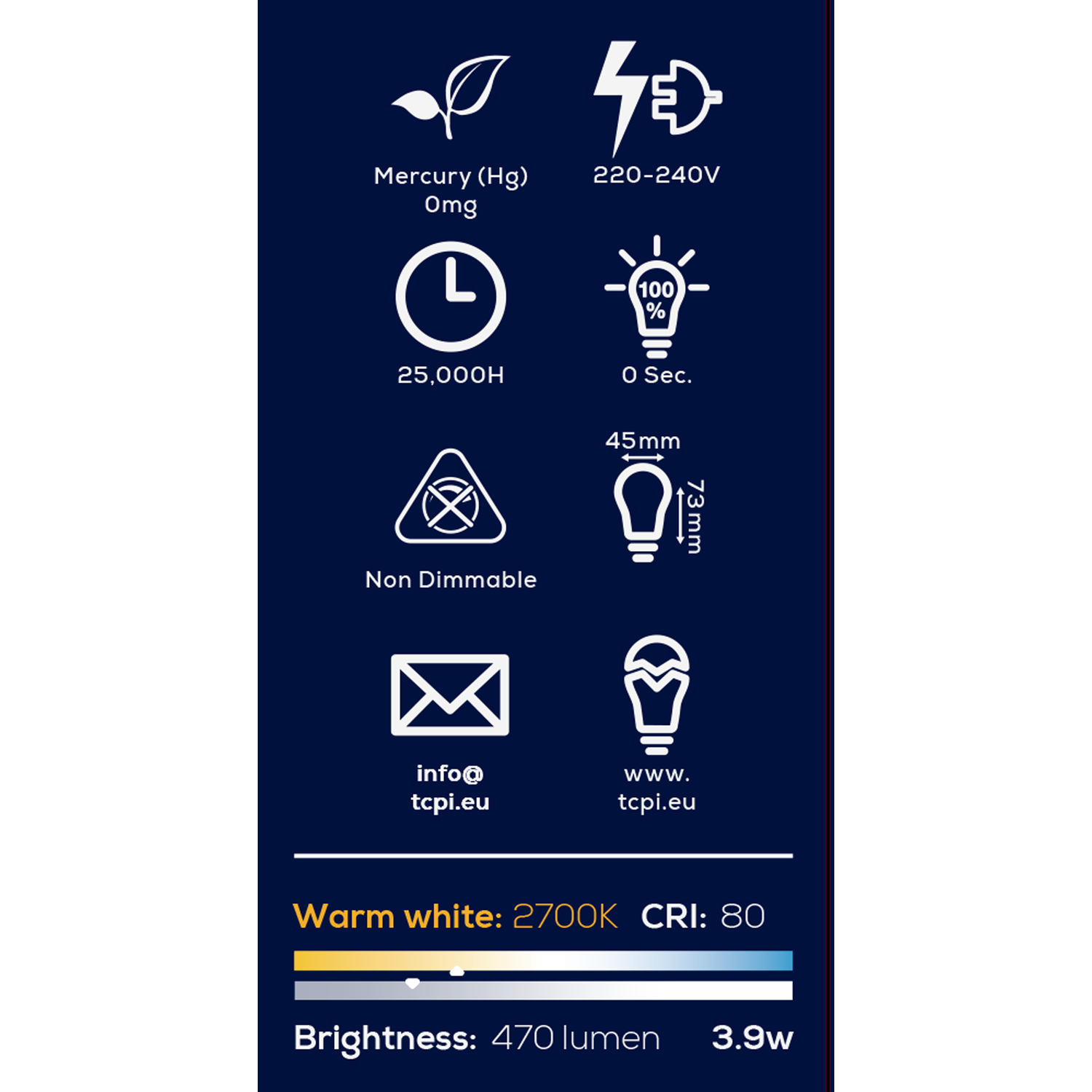 Light up your home with the TCP Filament Mini Globe 470L B22 Bulb. Its mini globe design with visible filaments perfectly complements vintage-style homes, while the warm white light creates a welcoming atmosphere in your space.