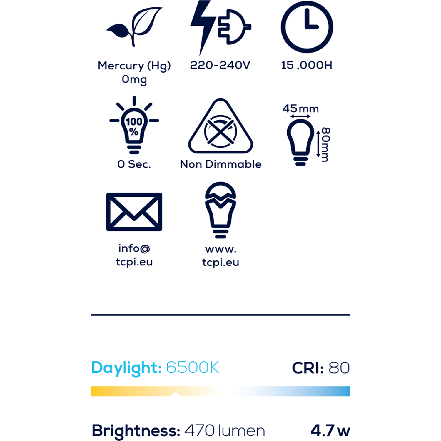 Brighten your space with the TCP LED Mini Globe 470L E14 Daylight Bulbs. Designed to provide a clear glow, these bulbs are suitable for areas where focus and visibility are needed. With their compact globe shape, they seamlessly fit into various fixtures, making them a versatile and practical choice for any room.