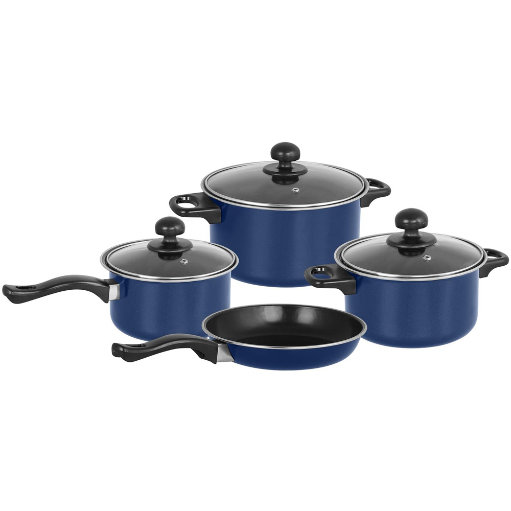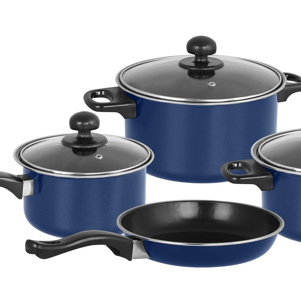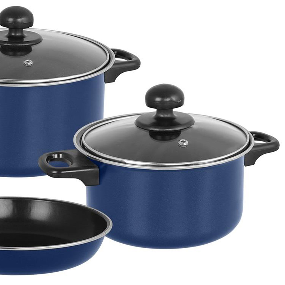 Equip your kitchen with the best with this Teal Blue 7 Piece Non Stick Carbon Steel Cookware Set With Lid. This cookware set is designed to last, crafted with heavy-duty materials suitable for all types of cooking. The non-stick-coated finish makes for easy cleaning and maintenance. Its features include a heat-resistant coating, vented glass lids, and stay-cool Bakelite handles. This set is perfect for everyday use and is suitable for gas, solid plate, ceramic, and halogen stovetops. The set includes a 25cm x 4cm fry pan (1.06L), 20cm x 9cm saucepan (2.04L), 22cm x 10cm casserole (2.7L), and 24cm x 12cm casserole (3.72L). Elevate your contemporary kitchen with this must-have cookware set.