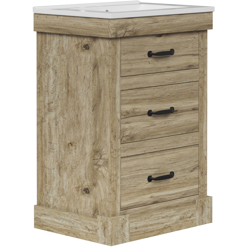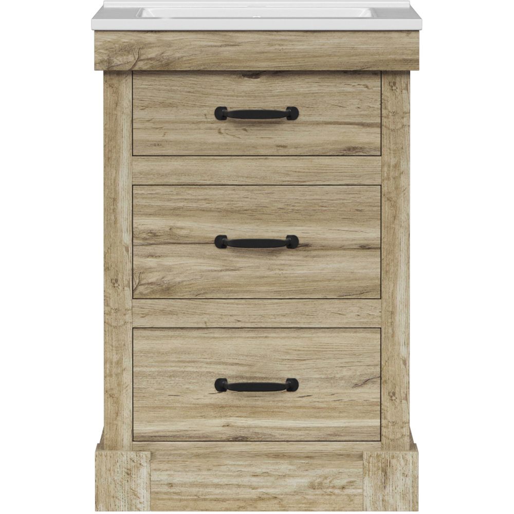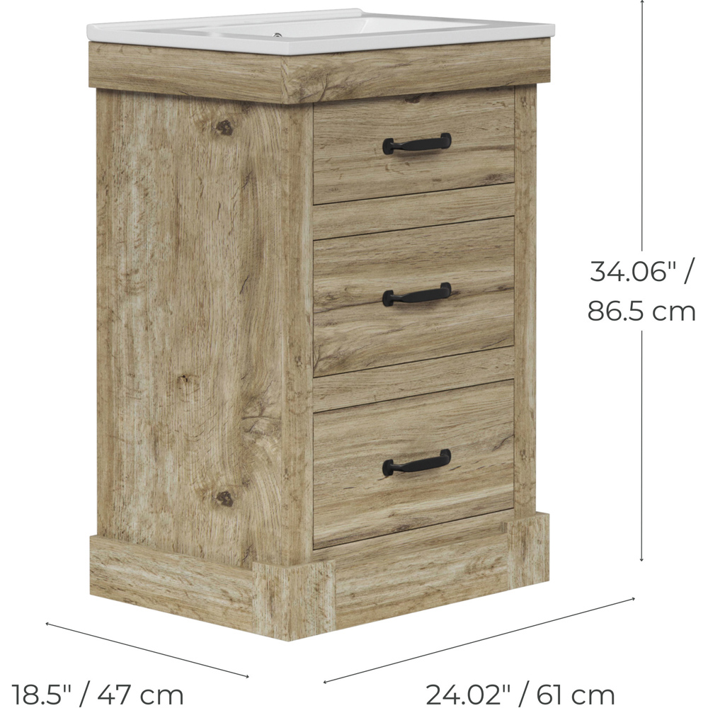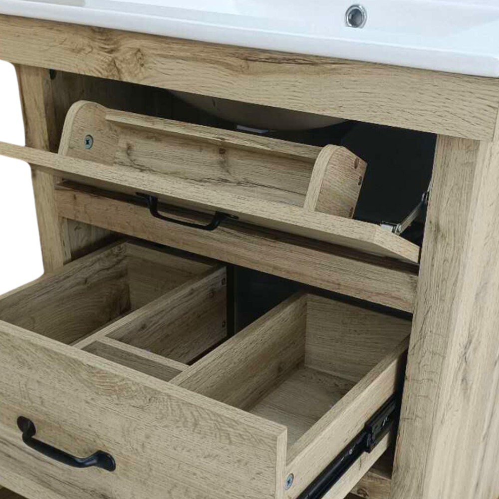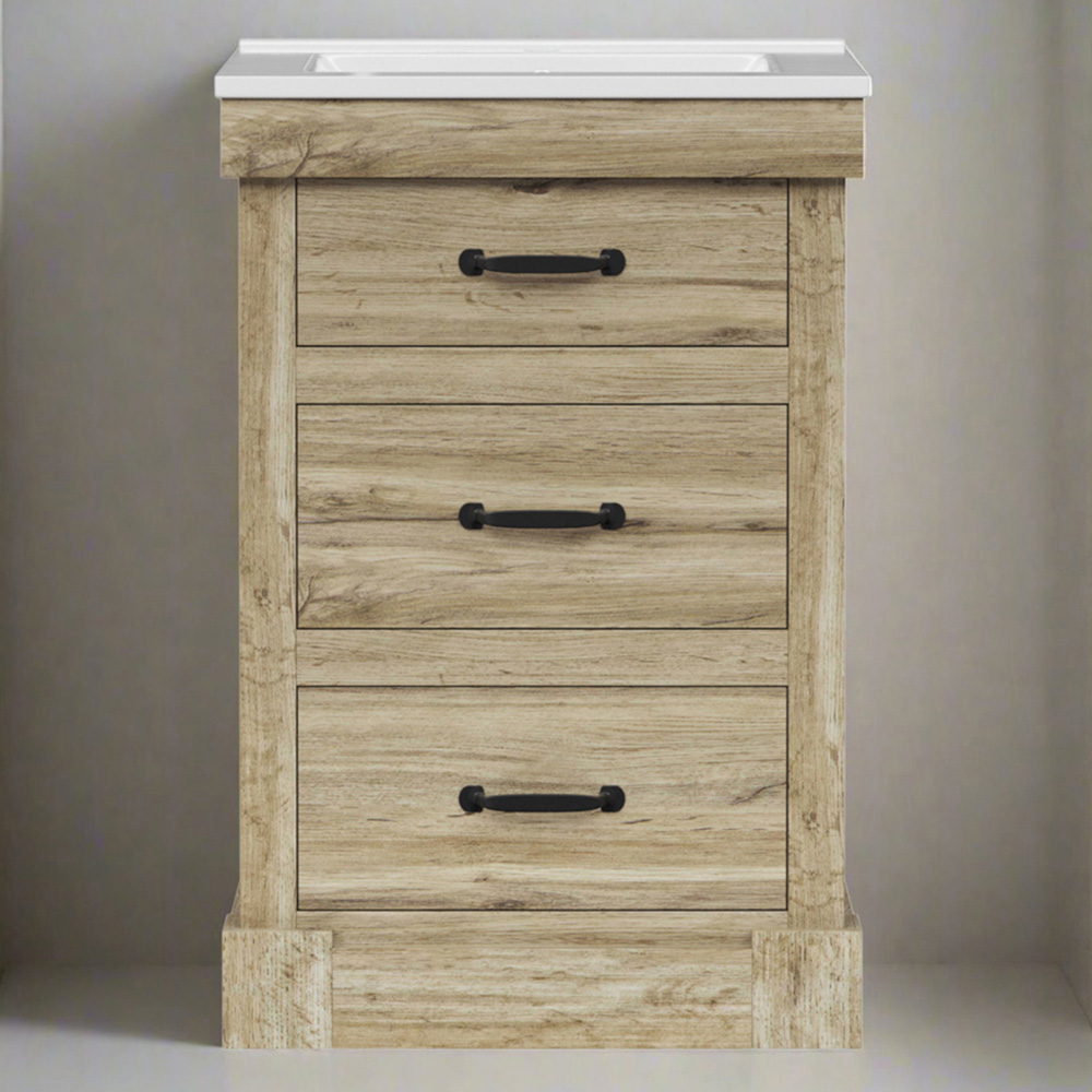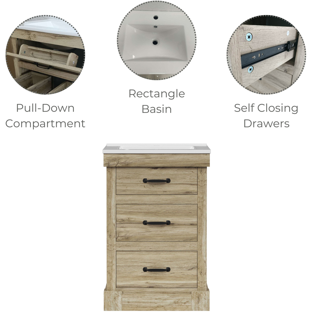 Bring contemporary charm and clever storage to your bathroom with a light oak bathroom vanity that pairs a crisp white ceramic sink with three versatile drawers, including a handy pull-down top for everyday essentials. Crafted from MDF with a detailed light oak finish and rustic matte black handles, this compact 24 inch vanity unit fits snugly in smaller spaces while keeping everything tidy, from toothpaste to towels. Soft-closing drawers, a U-shaped middle to accommodate plumbing, and a full-sized bottom drawer make organising your bathroom simple and stylish, while the elegant square-shaped basin adds a modern touch.