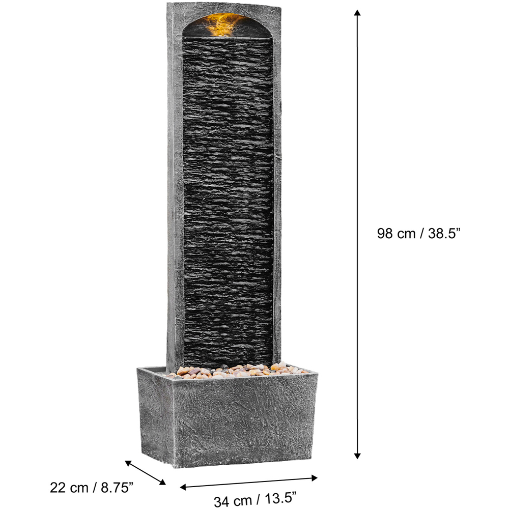Transform outdoor spaces into a peaceful retreat with a striking stone effect garden waterfall fountain for patios that blends contemporary design and soothing sounds. Crafted from durable polyresin with a faux black and stone grey textured wall, the waterfall flows gently into a pebbled base, enhanced by a soft LED light at the top to highlight the cascading water. Plug in this outdoor 98cm water feature with stone finish to enjoy a Zen-like ambience that elevates decks, patios or back gardens, letting you unwind in style.