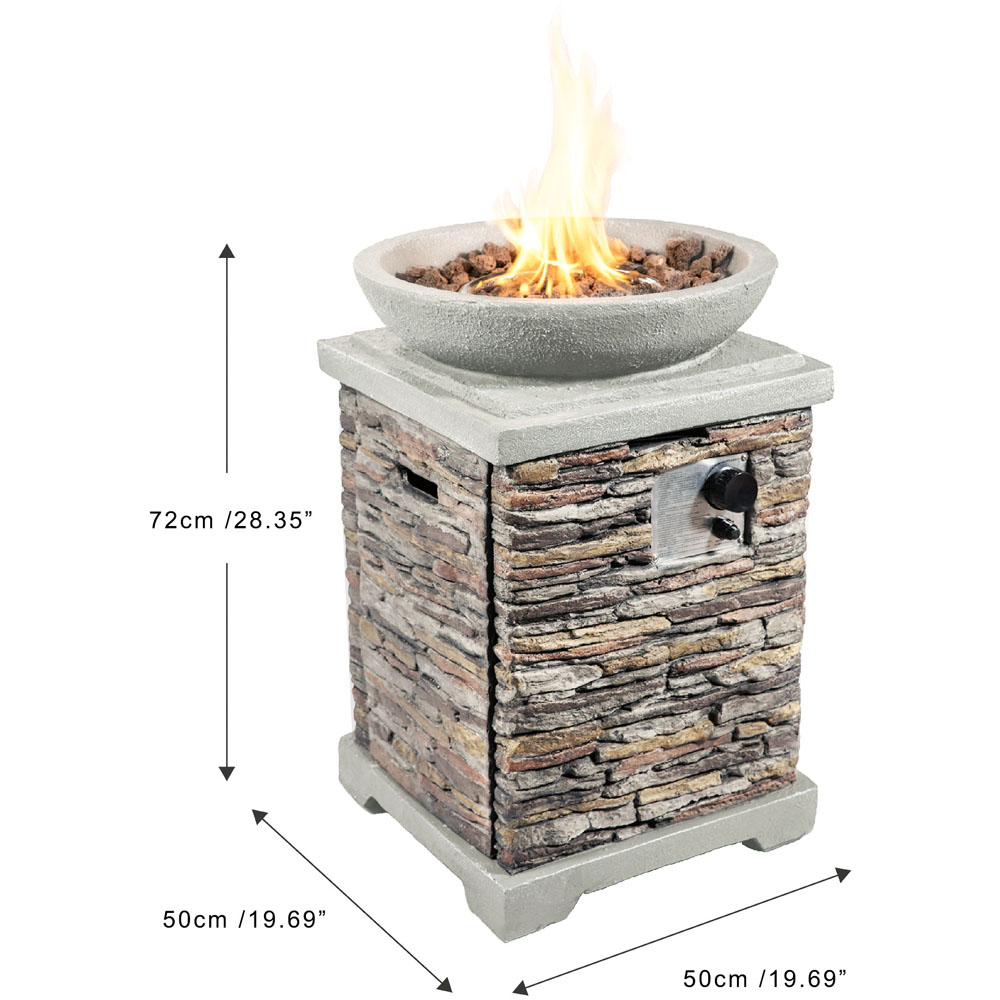 Create a cosy gathering spot in your garden with this square stone effect propane fire pit designed for outdoor spaces, blending rustic country charm with modern convenience. Crafted from natural slate with a robust steel base, it stands firm against the wind and offers a warm, inviting glow using the integrated fire bowl and authentic lava rocks. The slim profile hides a clever compartment for a five kilogram propane tank, easily accessible via a removable door that seamlessly blends with the stone finish. Safe and ETL approved, the fire pit comes complete with a PVC cover and three kilograms of lava rocks, so you’ll enjoy both style and function in your outdoor setting.