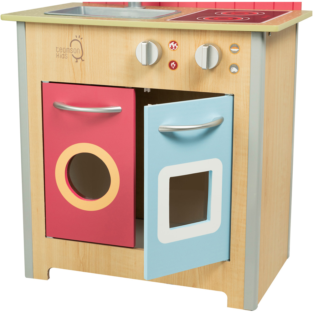 Spark imagination and inspire hours of creative play with a vibrant wooden play kitchen designed for little chefs who love to explore. Featuring a compact classic design with a natural wood finish, cheerful red and blue accents, and plenty of interactive elements, this red wooden kitchen set with accessories brings role play to life in any playroom or classroom. Children can open and close doors, turn clicking oven knobs, pretend to cook on printed burners, and organise their own spice rack, while the removable sink and included pot, lid, and shakers add extra fun. Sturdy wooden construction ensures it's safe for everyday play and easy to keep clean, and assembly is simple so the fun can start straight away. Perfect for toddlers aged three and up, it's a classic wood play kitchen for toddlers.