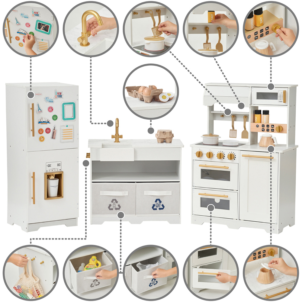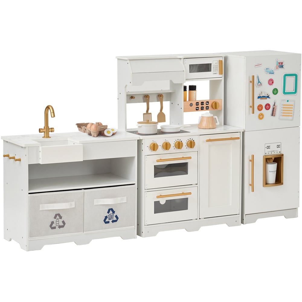Spark imaginations and encourage creativity as children design their own culinary space with a large modular play kitchen finished in crisp white and gold accents. Each play session brings new adventures, thanks to three freestanding wooden units—a refrigerator, stove with sink, and extra work counter—that can be arranged however kids like. Realistic features, including clicking knobs, a magnetic fridge door with working ice dispenser, and ample shelves, make every moment feel just like a real kitchen. Seventeen included accessories, from pots and pans to fridge magnets, let little chefs whip up pretend feasts and practise sharing and teamwork. Durable wooden construction and a timeless colour scheme mean this modular play kitchen with storage for kids UK fits seamlessly into any playroom, offering endless opportunities for imaginative play and learning.