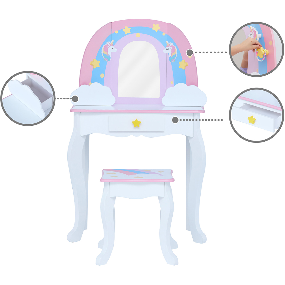 Spark imagination and brighten playtime with a medium size vanity table that brings rainbow magic right into your child's bedroom or play area. Featuring a vibrant unicorn and rainbow design, this playful vanity set comes with an arch-shaped mirror, a matching stool and three cloud-shaped drawers for storing treasures like jewellery and play makeup. Star and unicorn shaped hooks add extra fun for hanging accessories, while the sturdy MDF build with rounded corners and toughened glass mirror means it's safe and easy to keep clean, making every day feel special for your little dreamer.