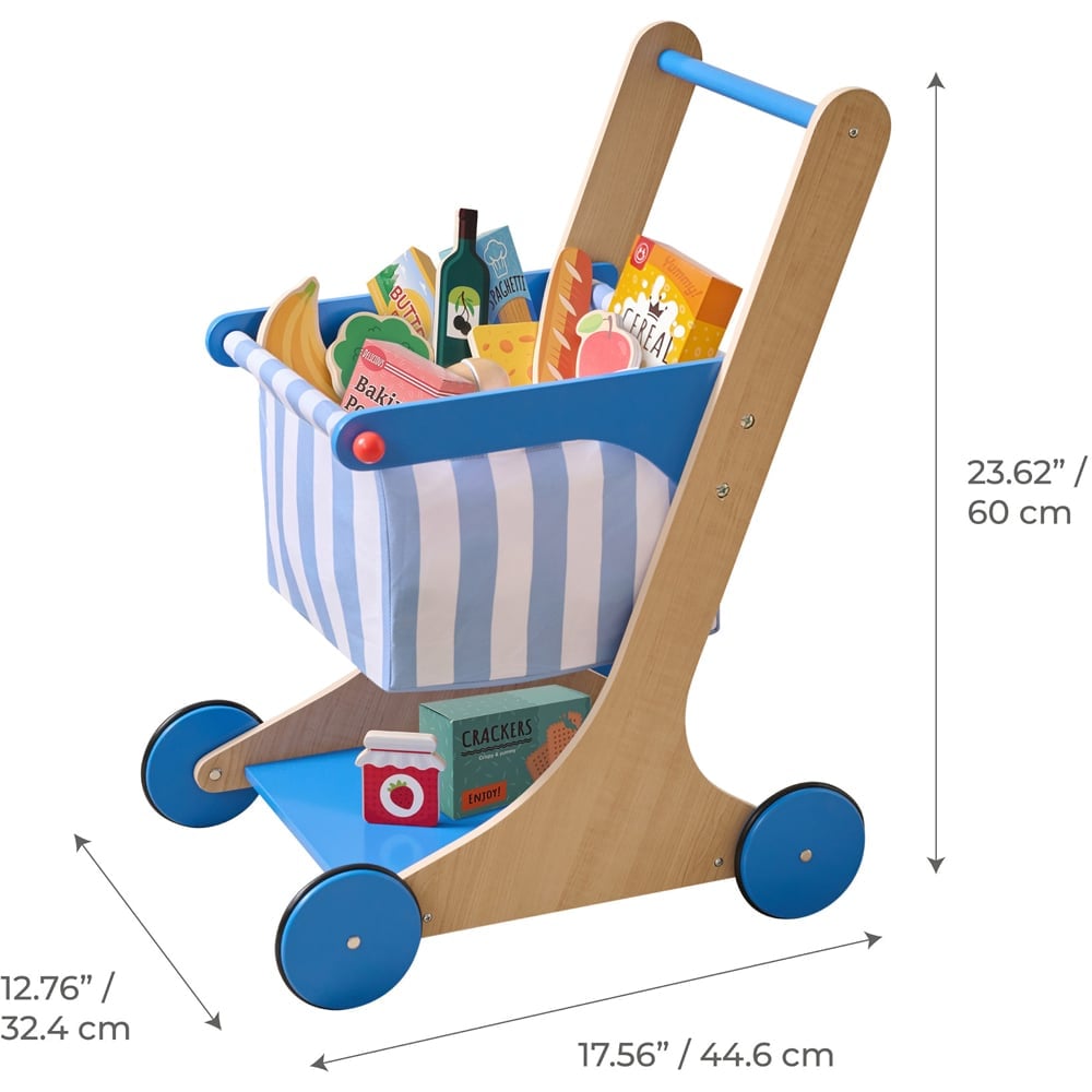 Spark imagination and movement as children embark on playful supermarket adventures with this vibrant blue and white kids shopping cart, designed to inspire creativity, develop motor skills, and encourage independent role-play. Featuring a sturdy frame, striped fabric basket, and smooth wheels, little ones can confidently push their cart throughout the home, practising balance and coordination. The ergonomic handle and wide base offer stability for new walkers, while thirteen realistic wooden and fabric grocery items invite sorting, storytelling, and hands-on fun. Perfect for children aged three and up, this compact trolley blends joyful play with valuable learning, making every shopping trip a new discovery.
