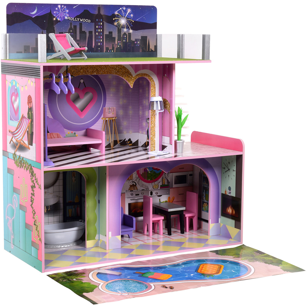 Spark imagination and create magical stories every day with a multi-storey wooden doll house that bursts with colour and creativity, designed for endless adventures and interactive play. Dreamland Sunset features three floors of modern living, a spiral staircase, a rooftop terrace with changeable day and night scenes and comes with 16 playful accessories including a light-up lamp, dining set, bedroom suite and even a folding pool lounge chair. Children can decorate each room with two sticker sheets packed with letters, numbers, pets and flowers, making every play session unique and personal. Built from durable wood, it's easy to clean and safe for little hands, fitting all 12-inch dolls and perfect for any playroom, nursery or classroom. Quick and simple to assemble in under 20 minutes, it's ideal for children aged three and up, offering hours of creative fun.