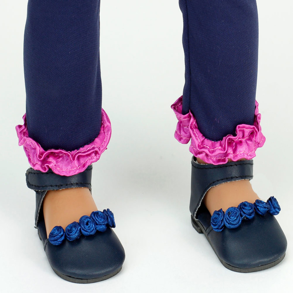 - Outfit includes polka dot top, navy leggings, ankle strap shoes