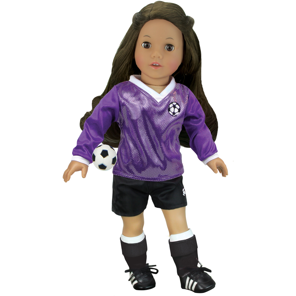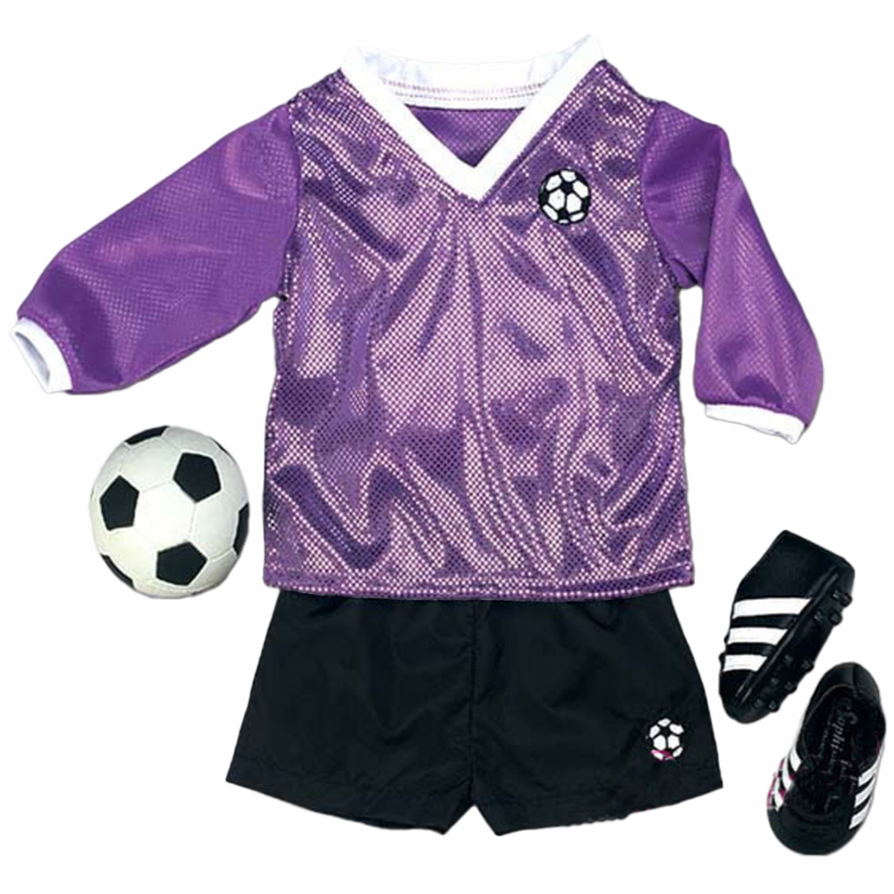 Spark excitement for playtime as the 18 inch doll soccer kit with purple uniform and accessories transforms any doll into a football star, complete with a shimmering purple jersey, black shorts, bouncy football, socks, cleats and clip-on shin guards for realistic match-day adventures. Kids will love dressing their favourite dolls in this vibrant set, featuring an embroidered football and number one detail that inspires hours of imaginative play, teamwork and sporting fun. Designed to fit most popular 18 inch dolls, the doll football outfit with shin guards and cleats for 18 inch dolls makes every match feel special and encourages active storytelling.