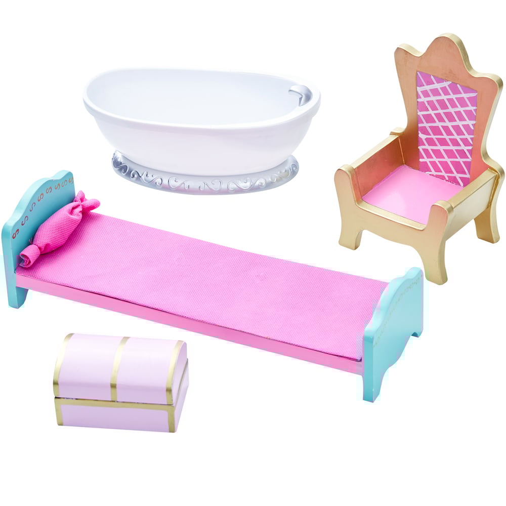 - Includes bathtub throne bed and chest accessories for 12-in dolls