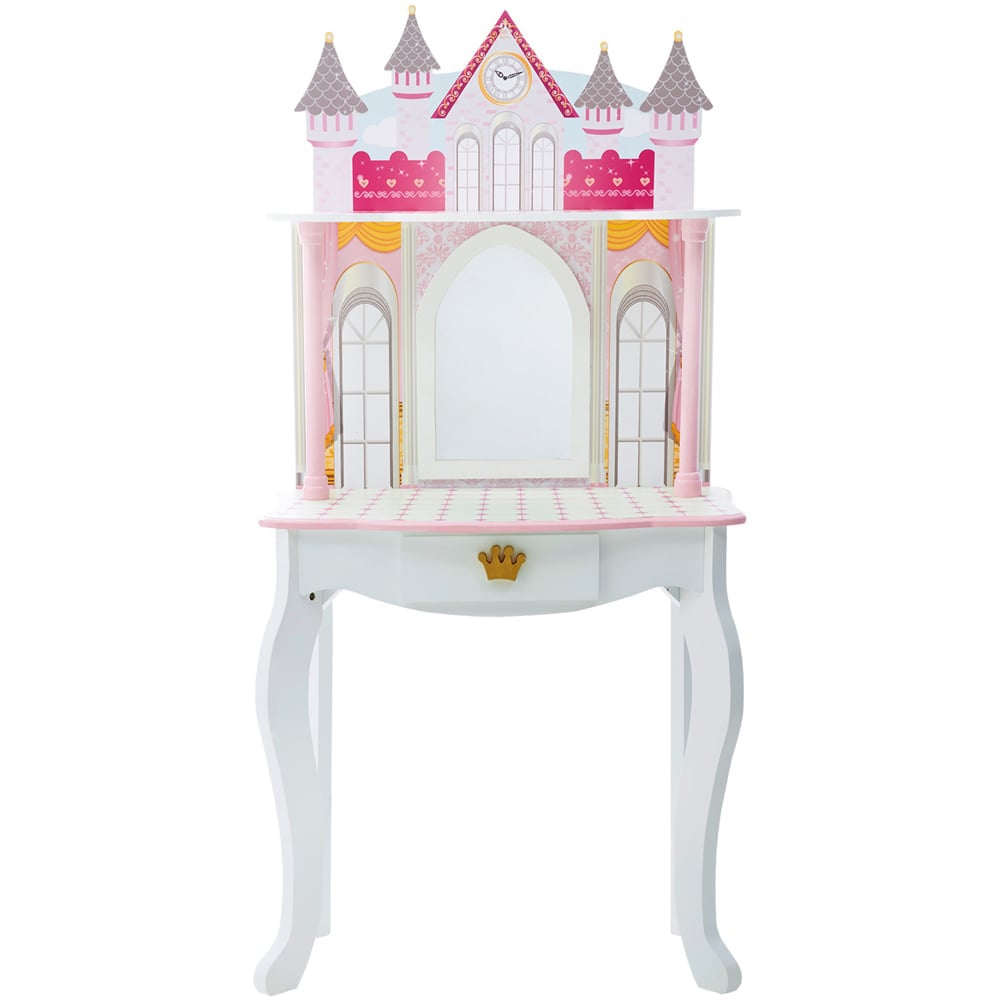 Spark imaginations and turn playtime into a fairy tale adventure with a castle themed kids vanity set featuring a charming mirror and playful castle design in white and pink. Crafted from durable wood with rounded corners and elegant cabriole legs, the set includes a compact vanity table, matching stool, and four delightful accessories for twelve-inch dolls, making it perfect for any playroom or bedroom. A spacious drawer keeps treasures like makeup, jewellery and brushes neatly organised, while the included doll-sized bathtub, throne, bed and chest add extra magic to dress-up sessions.